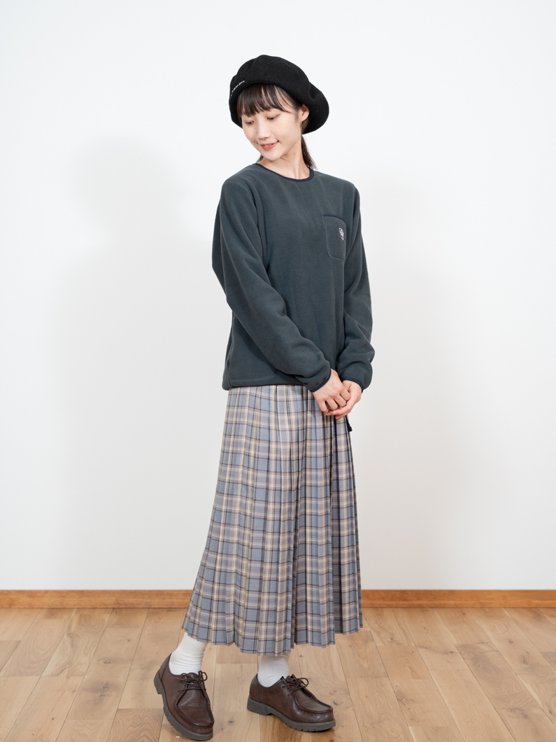 細めのプリーツスカートで揺れが可愛いスカートです!ウエストはゴム仕様で伸縮性が高く、また、ベルト付きなので調節も着脱も簡単。丈は腰骨の位置で着用して膝下20cmのミディアム丈なので、身長が低めの方から高めの方まで着用可能な長さになっています。表地の手触りはカラーによって異なり、グレーは少し起毛したようなふわっとした生地、ブラウンはグレーよりも起毛は抑え気味の少しハリあるような生地になっていますが、どちらも秋冬向けの生地になっています。表地だけでも透け感はありませんが、こちらのアイテムは裏地付きで透け感は全くなく、タイツ1枚で安心して着用していだくことができます!ブラウスできれいめコーディネートでまとめるのも、長袖Tシャツなどでカジュアルにまとめるのもおすすめの1枚。ミディアム丈なのでショートブーツやハイカットスニーカーなど、長さのある靴と合わせられるのもおすすめのポイント。プリーツが広がりにくいので下半身が大きく見えにくく、すっきりとした印象で着用していただけます。