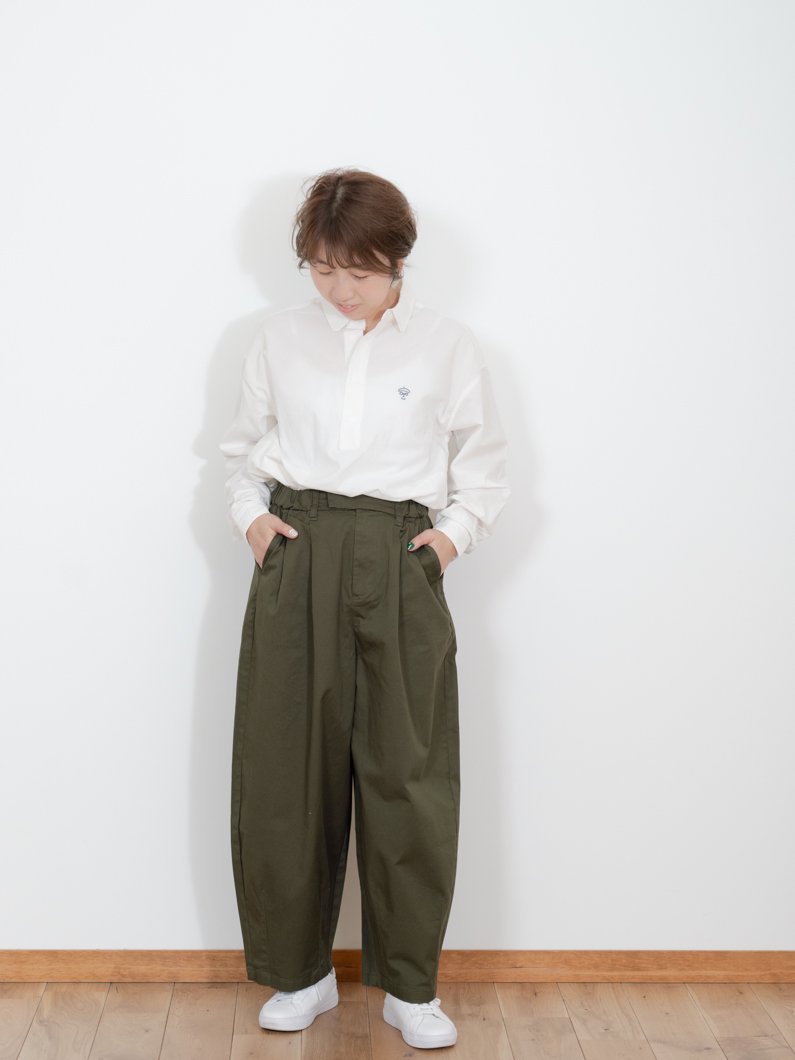 ヒップのあたりから丸く膨らんだ形が特徴的なサーカスパンツです!丈はくるぶし上5cmくらいで、ウエストは後ろ側のみゴムになっているので着脱も簡単。ベルトループがついているので、細身体型でもベルトでウエストを調整して着用することができます。さらりとした履き心地なので季節を問わずに履くことができ。サンダルやパンプスはもちろん、ハイカットスニーカーやブーツを合わせても可愛いです!ウエストの後ろ側のみゴムになっているので、トップスをウエストにインしてもカジュアルになりすぎず、むしろパンツの特徴的な形が際立つスタイリングになります。ゆったりとしたデザインながら着ぶくれして見えることなく、体型カバーの叶うボトムスです♪