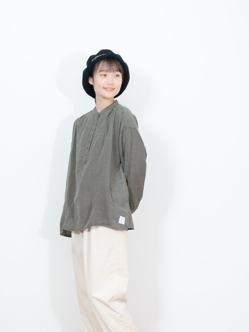 バンドカラーデザインに、ボタンは本体と同じ生地を採用し、
