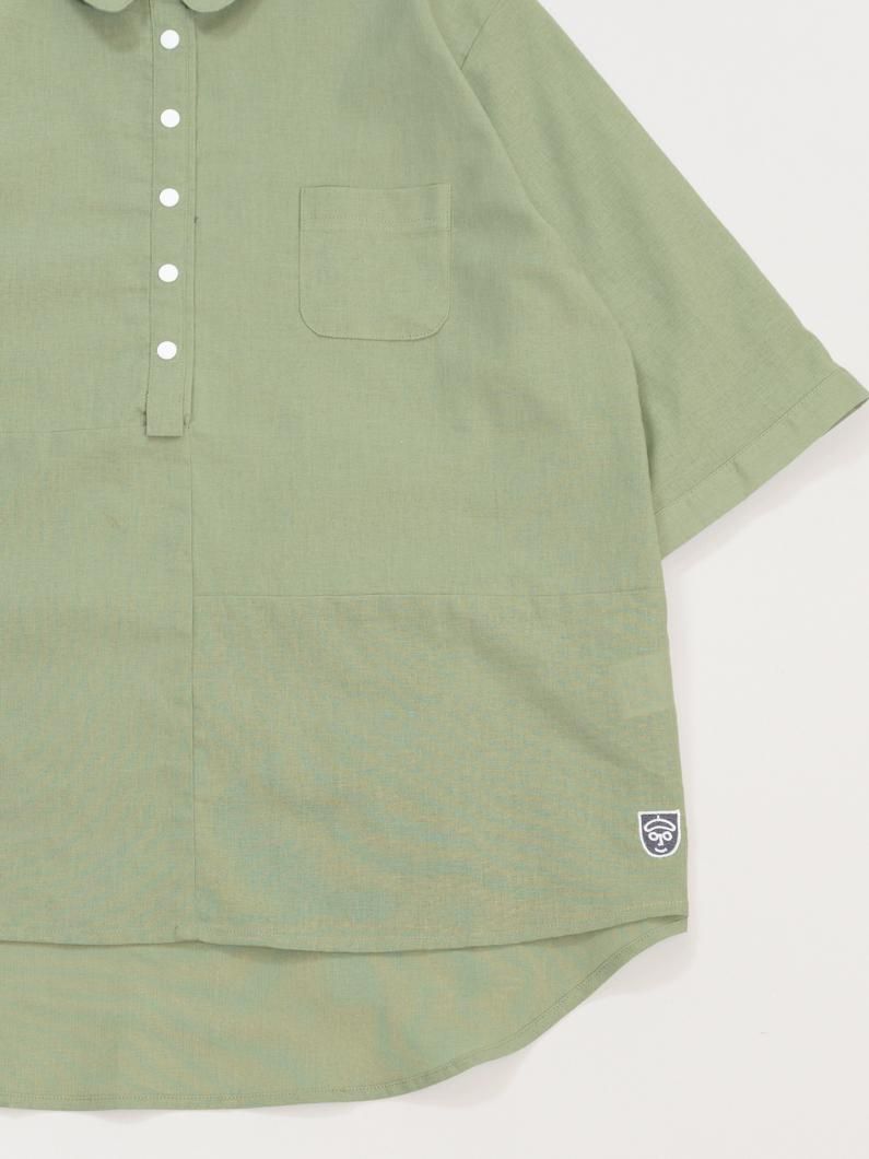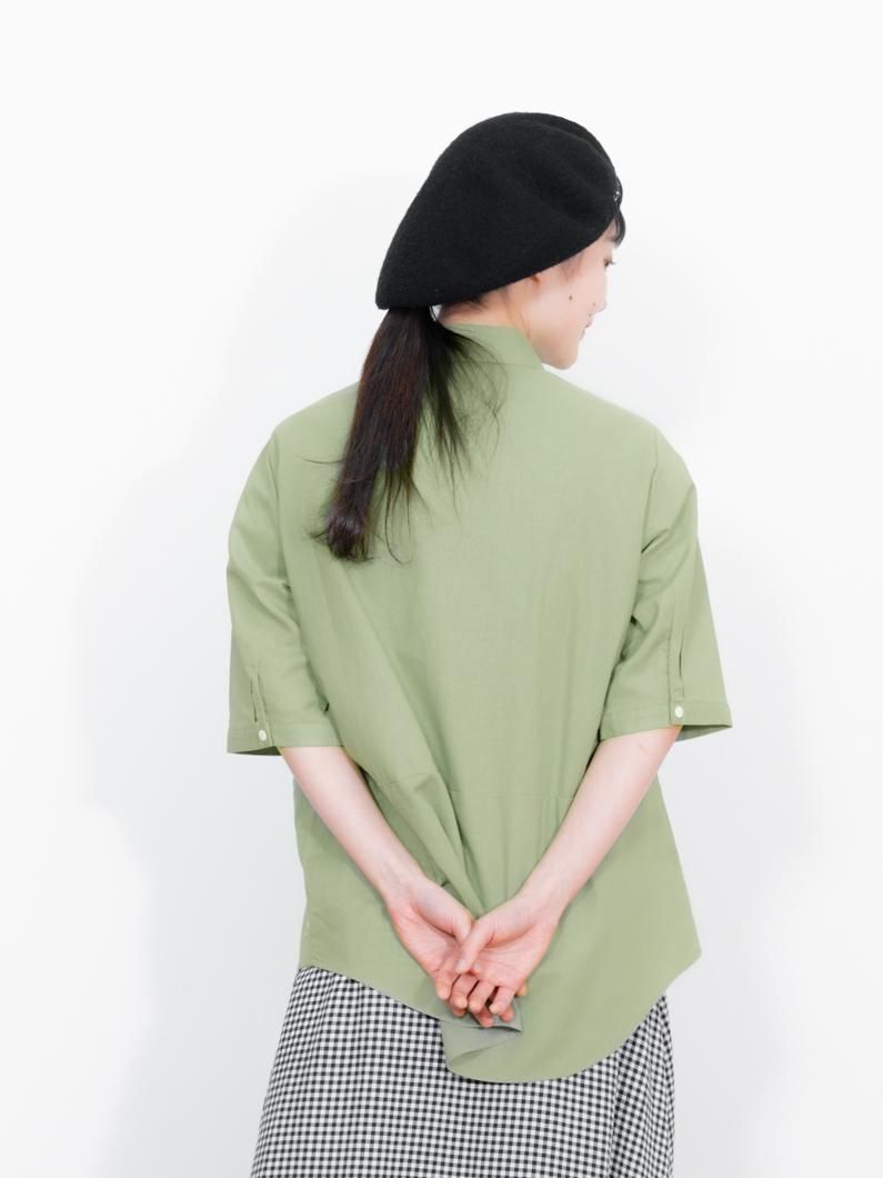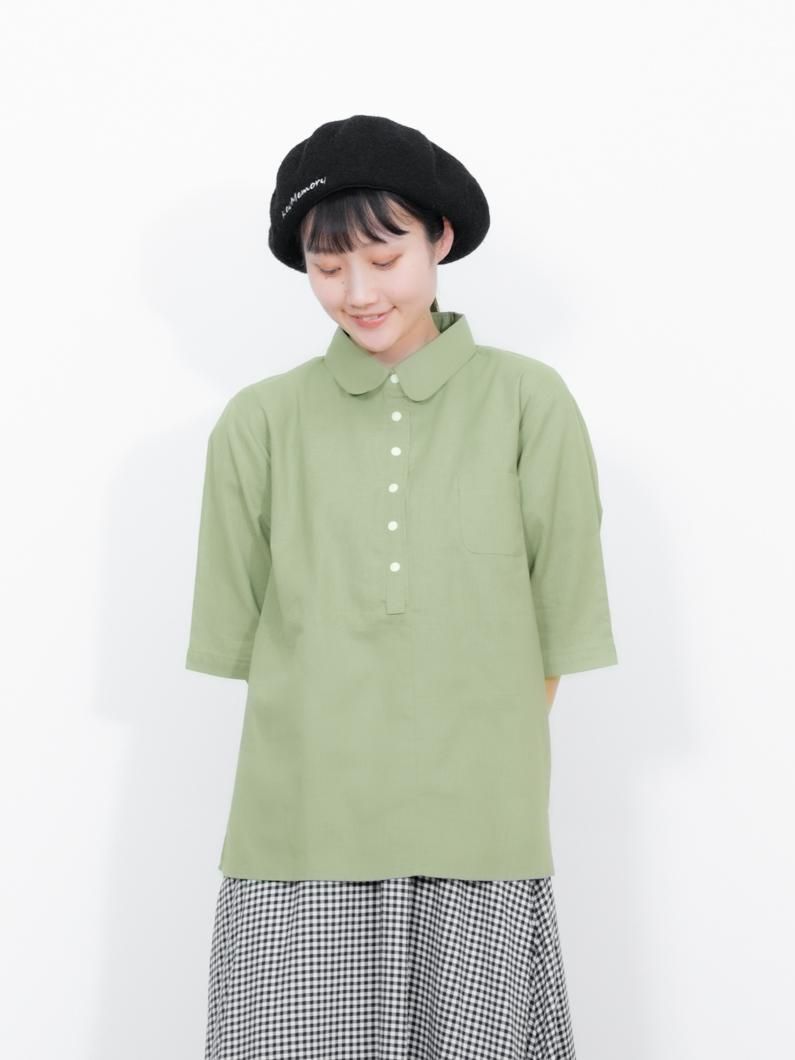 綿と麻の混合生地で、夏らしく涼しい1着。裾丈は前後の丈が異なり、後ろの方が長めでヒップがまるっと隠れるくらいの長め。袖は肘にかかるくらいの5分袖で、二の腕も隠せる長さになっています。暑いと感じるときには、袖口のボタンを外して2回くらい折って半袖のようにして着用しても可愛いです!台形のような少し裾広がりになっている形で、胴回り胸周りもゆとりがあります。ボタンはすべてスナップボタン仕様になっているので片手での着脱も簡単。女性らしい柔らかい雰囲気にしてくれる丸襟もポイントです。チェックは色と柄のおかげで透けが気にならず、春夏らしい白は少し透け感があるのでインナーにベージュなど目立ちにくいものを選んでいただくことをおすすめします。Aラインのシフォンスカートやワイドパンツ、スキニーパンツなど様々なボトムスとの相性が良く、ボトムスの形によってカジュアルにもきれいめな印象にもなる万能アイテムです!