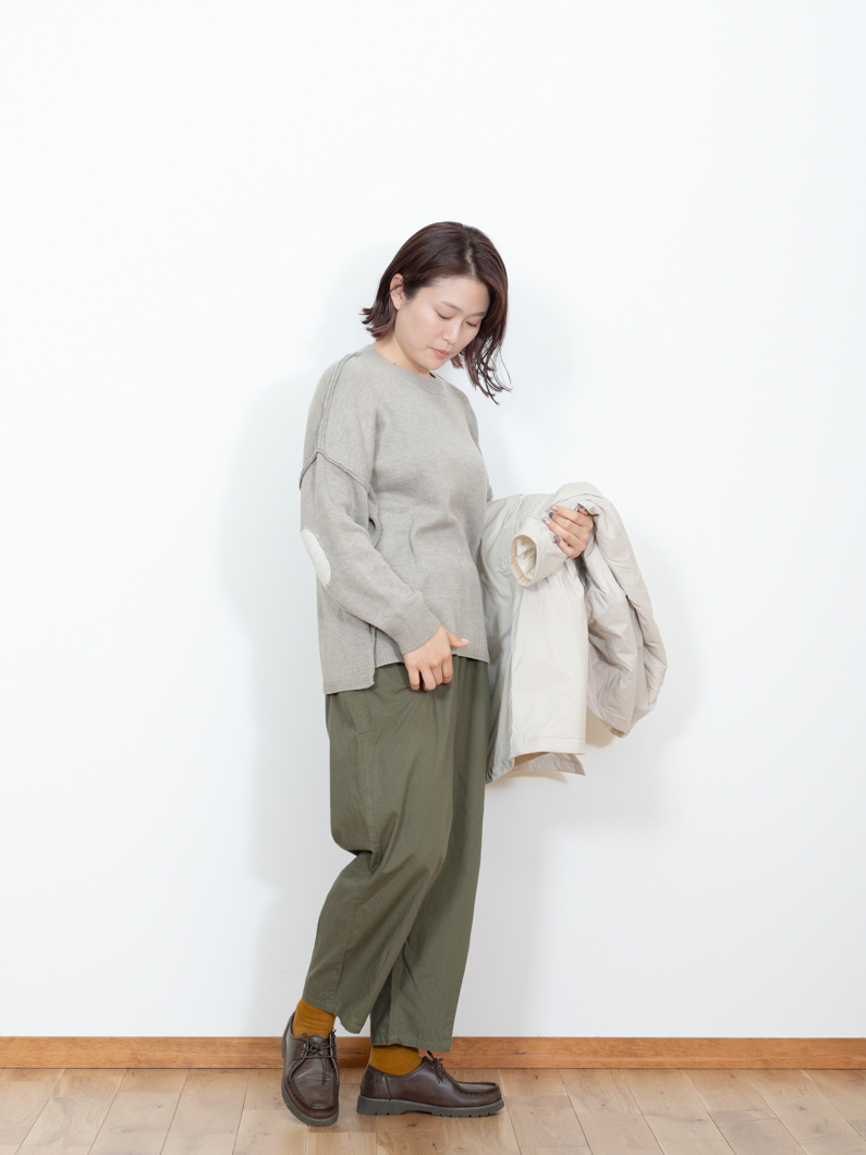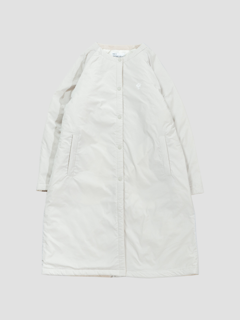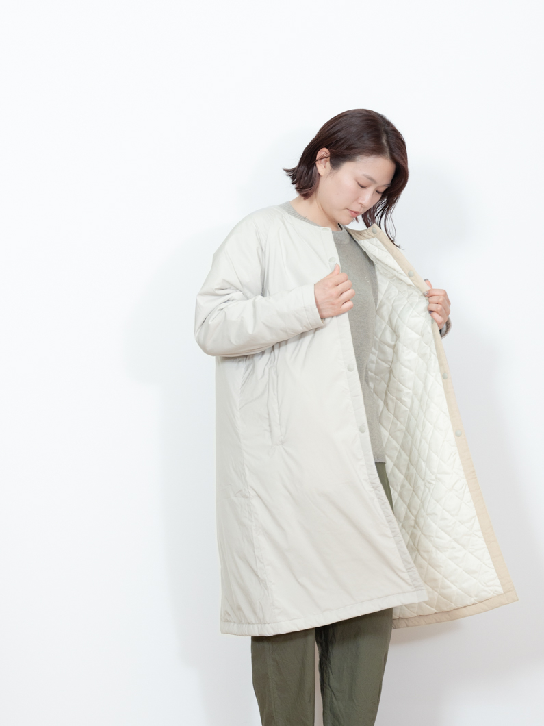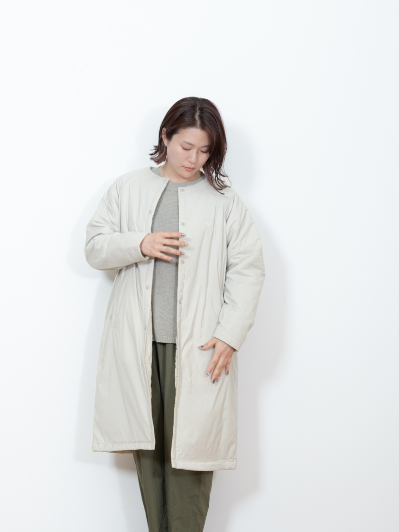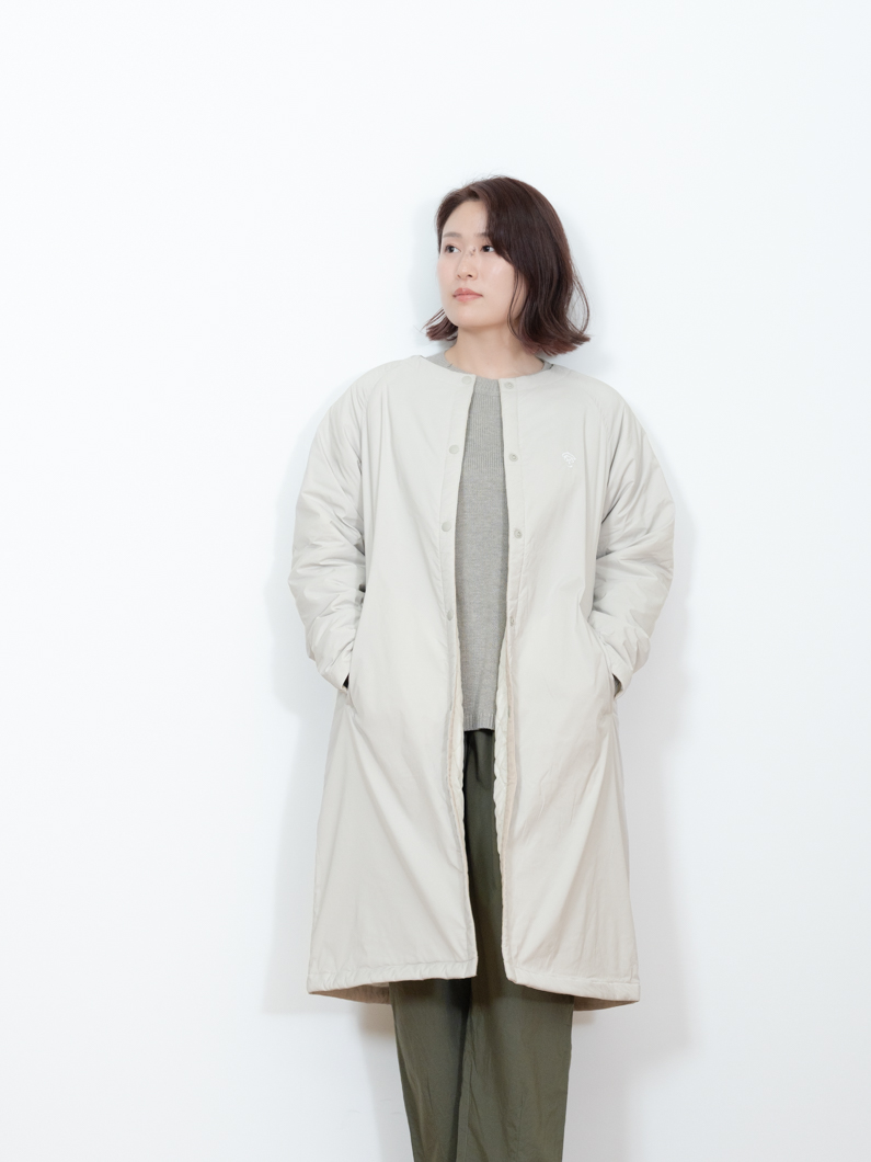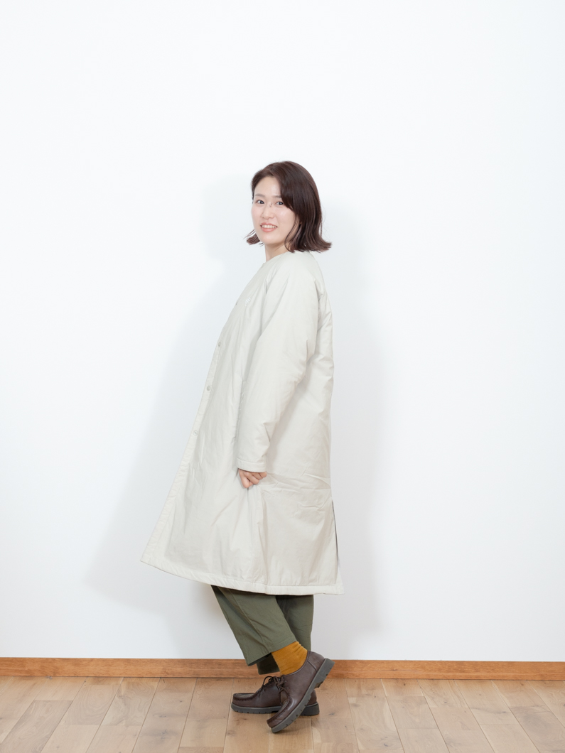 Collarless long puff coat L.GRAYを使用したコーディネート。