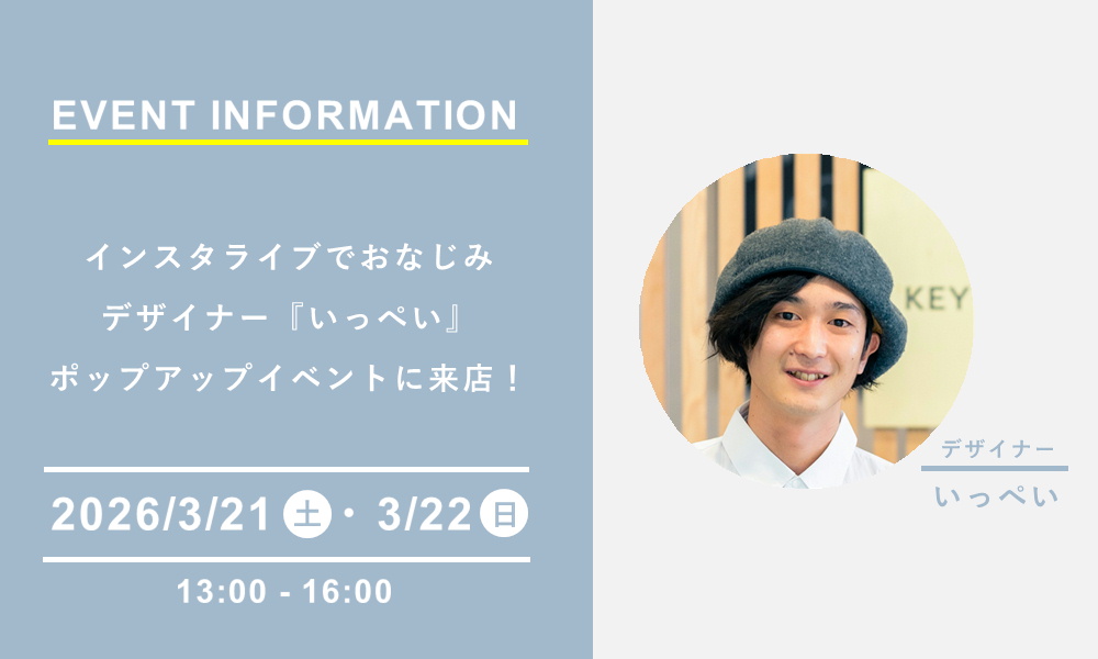 今回の川徳ポップアップイベントでは、インスタライブに出演している、KEYMEMORYデザイナーの  「いっぺい」が販売員として来店!普段中々お会いできないお客様にお会いするのを楽しみにしております!!