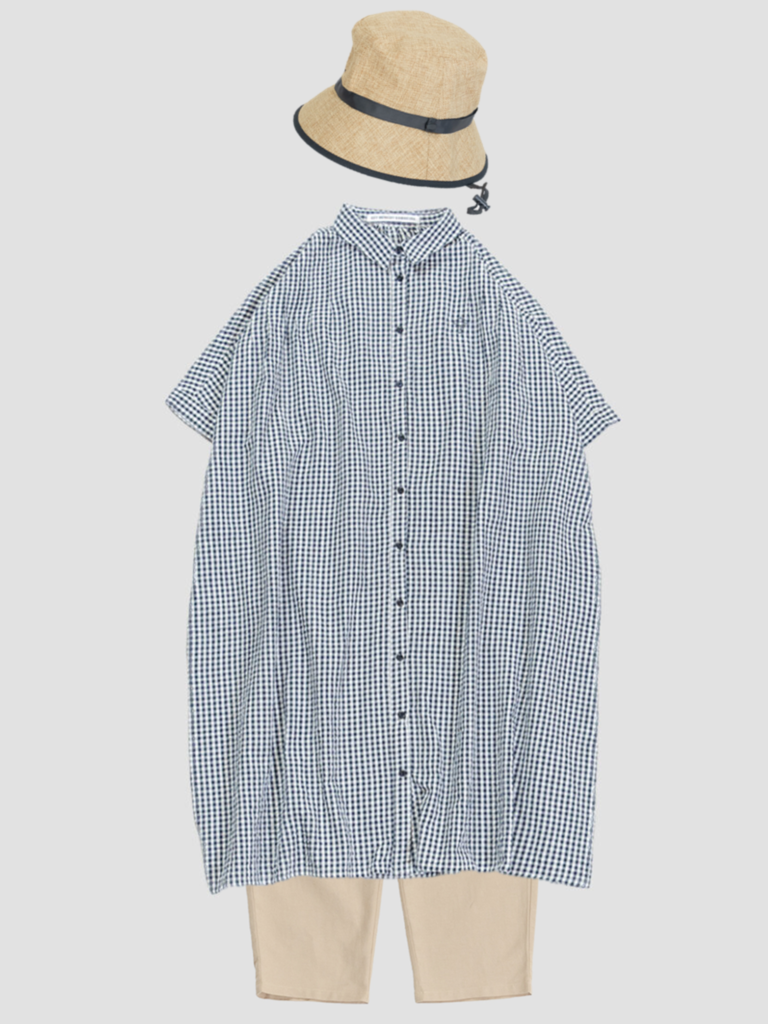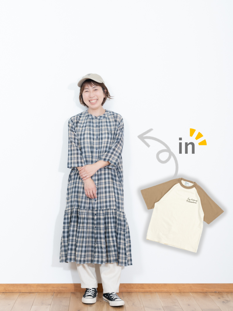ナチュラルカラーのラグランTに、甘辛チェックワンピを羽織ってアクセントに。肌寒い時はボタンをしめて、暑い時は脱いでバッグにイン!Checked shirt dressはしわが気にならない生地感なので旅行にも最適です。