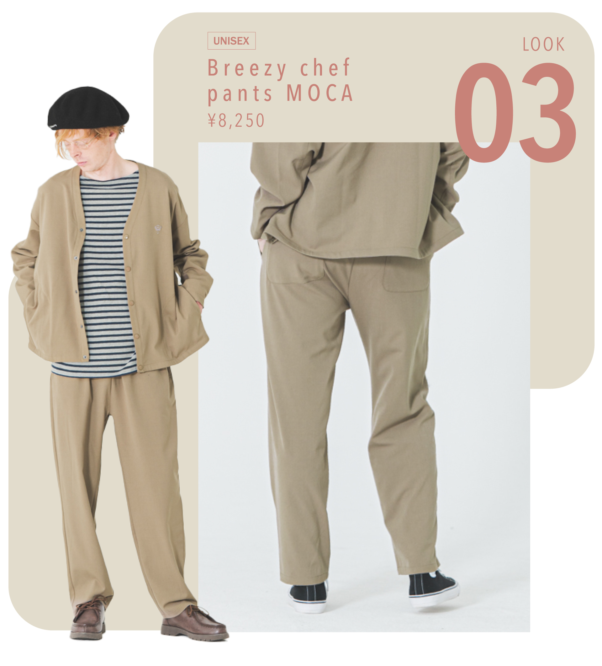 上下でセットにもできるカーディガンジャケットとシェフパンツ、