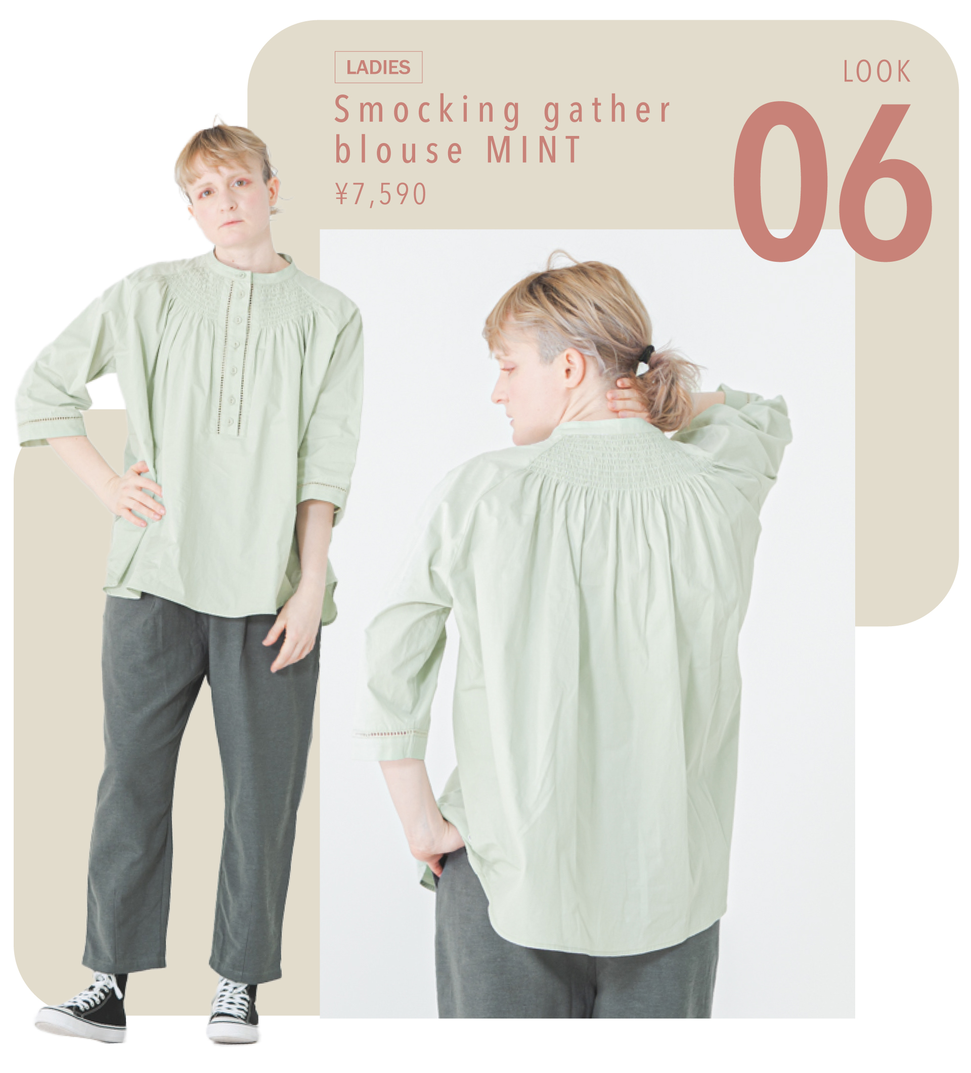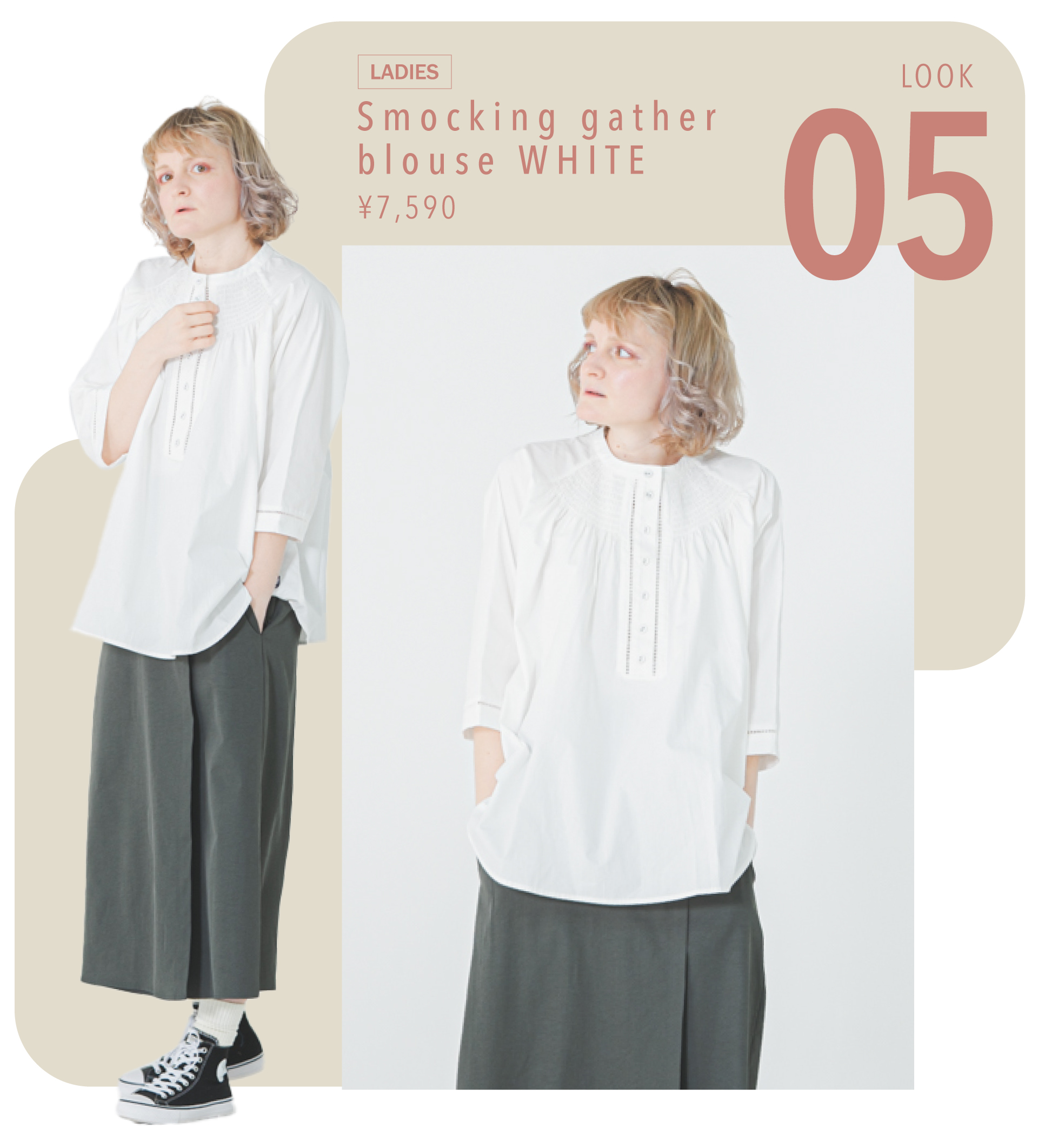 表情豊かなスモッキングギャザーブラウス、