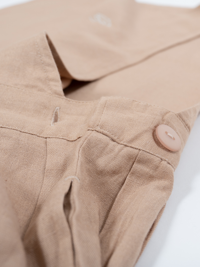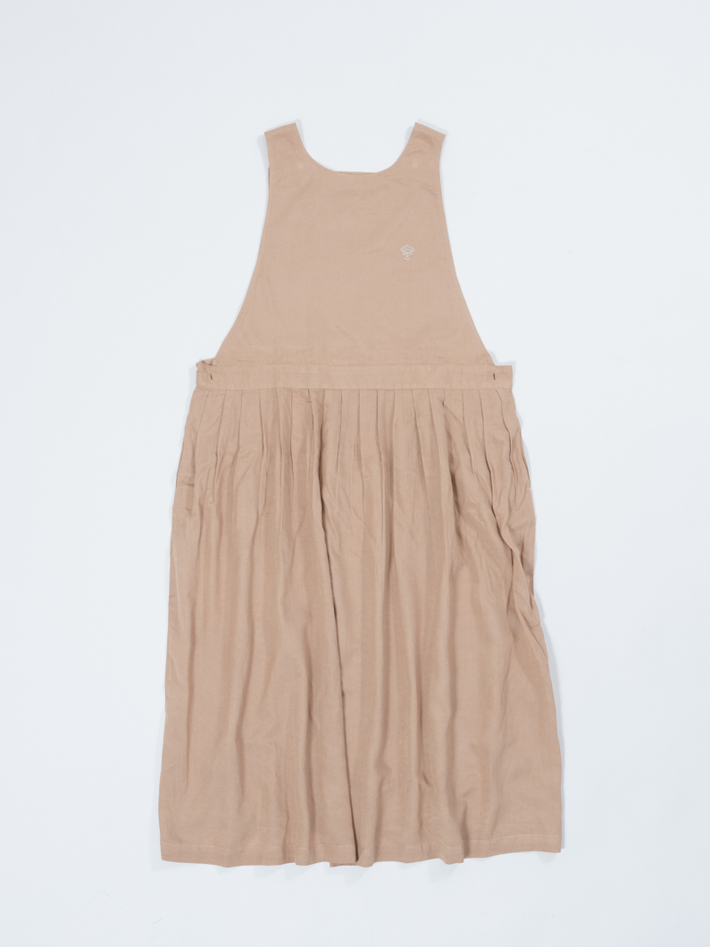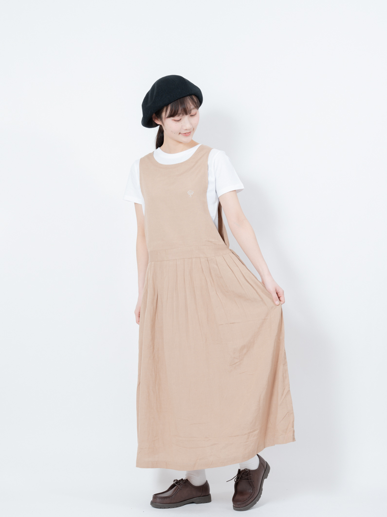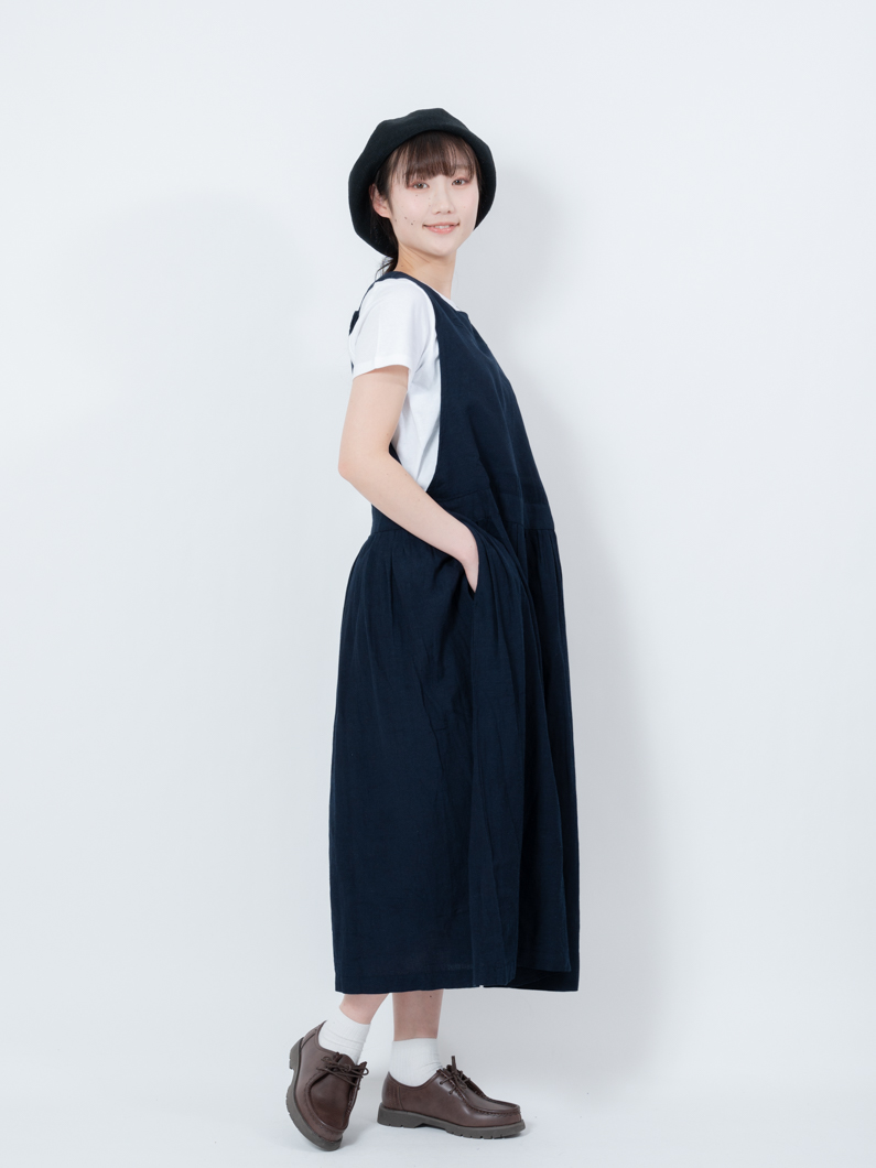 綿麻混でナチュラルな素材感のサロペワンピース。