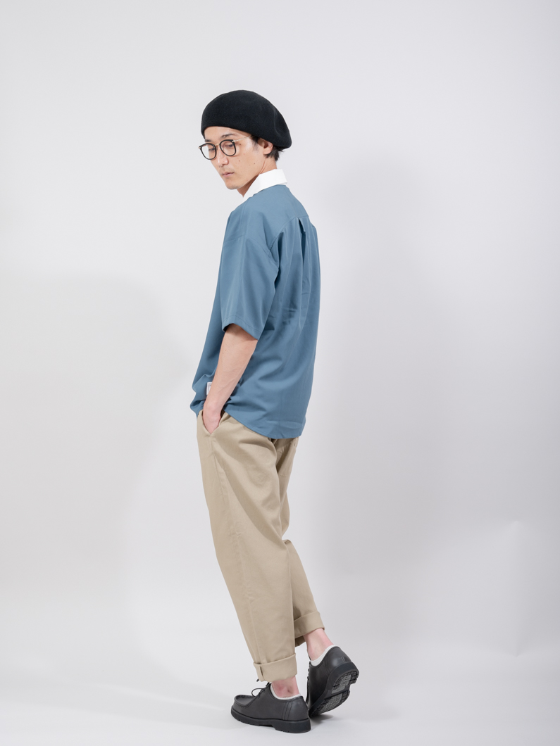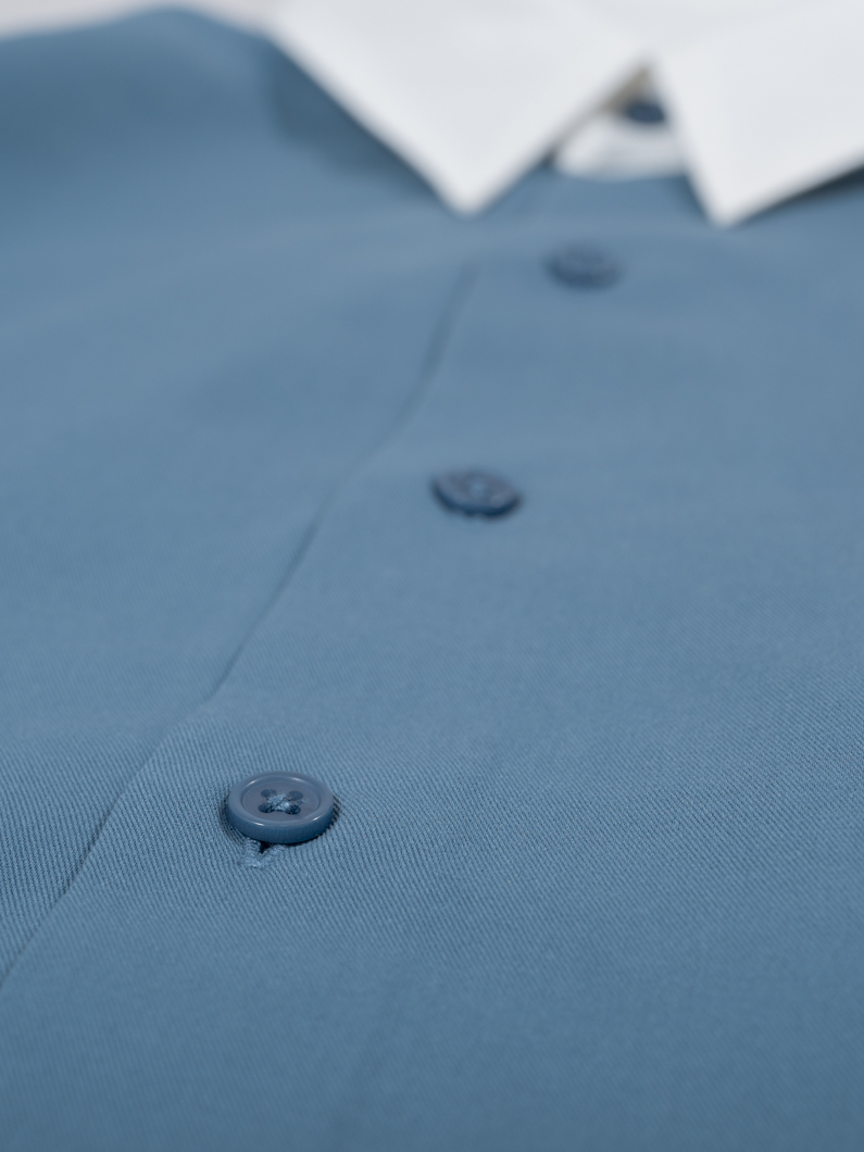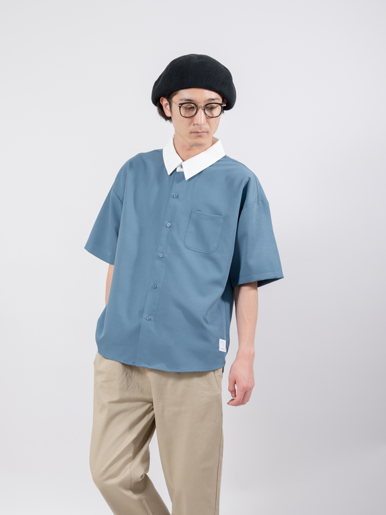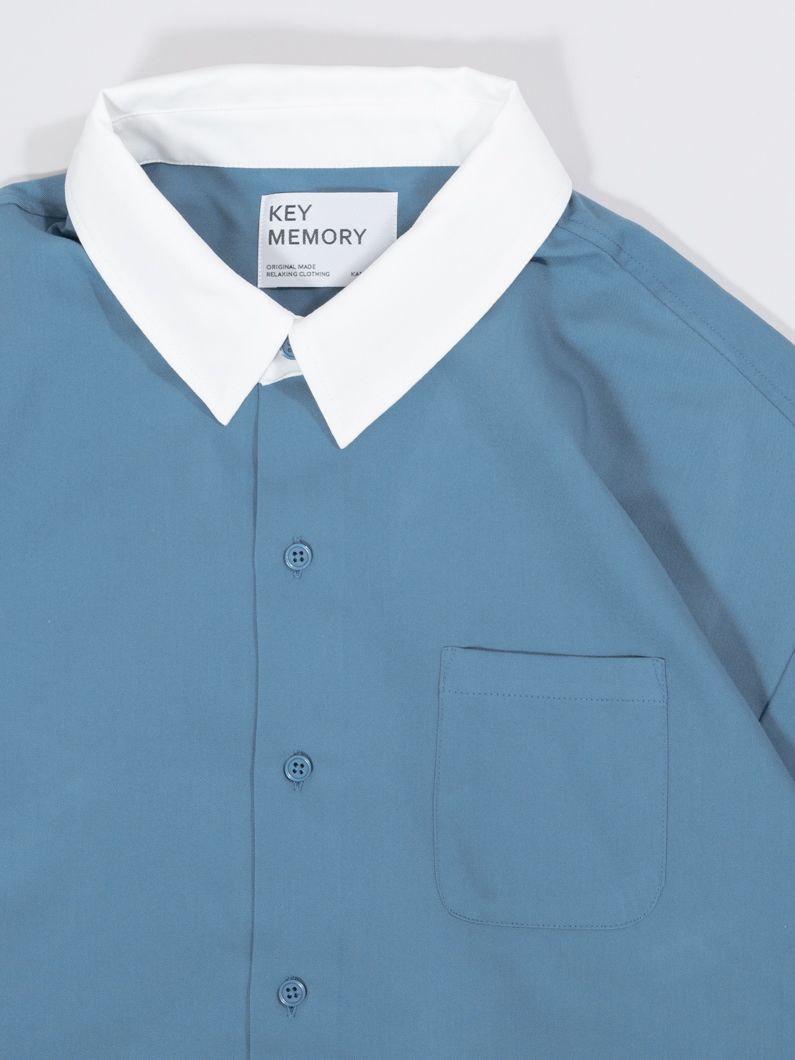 襟と生地が違うクレリックデザインのシャツで、