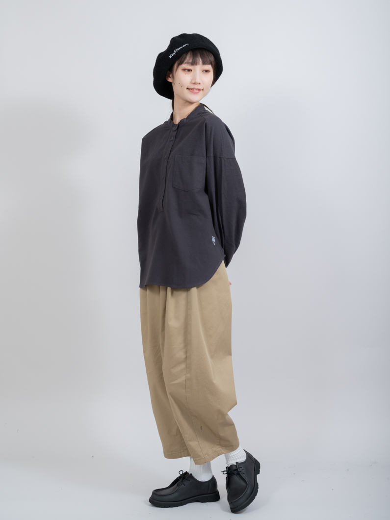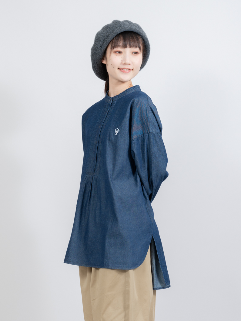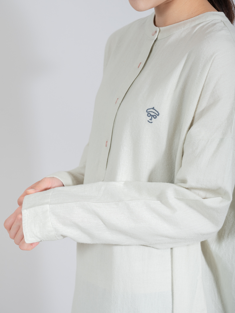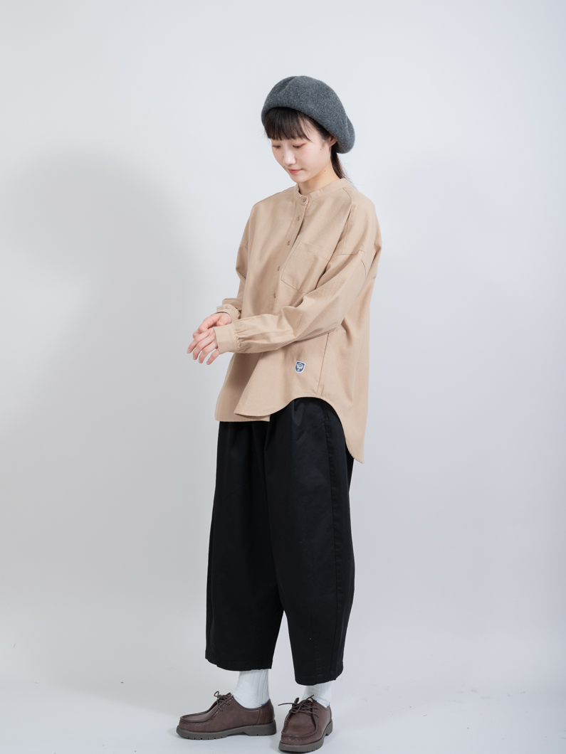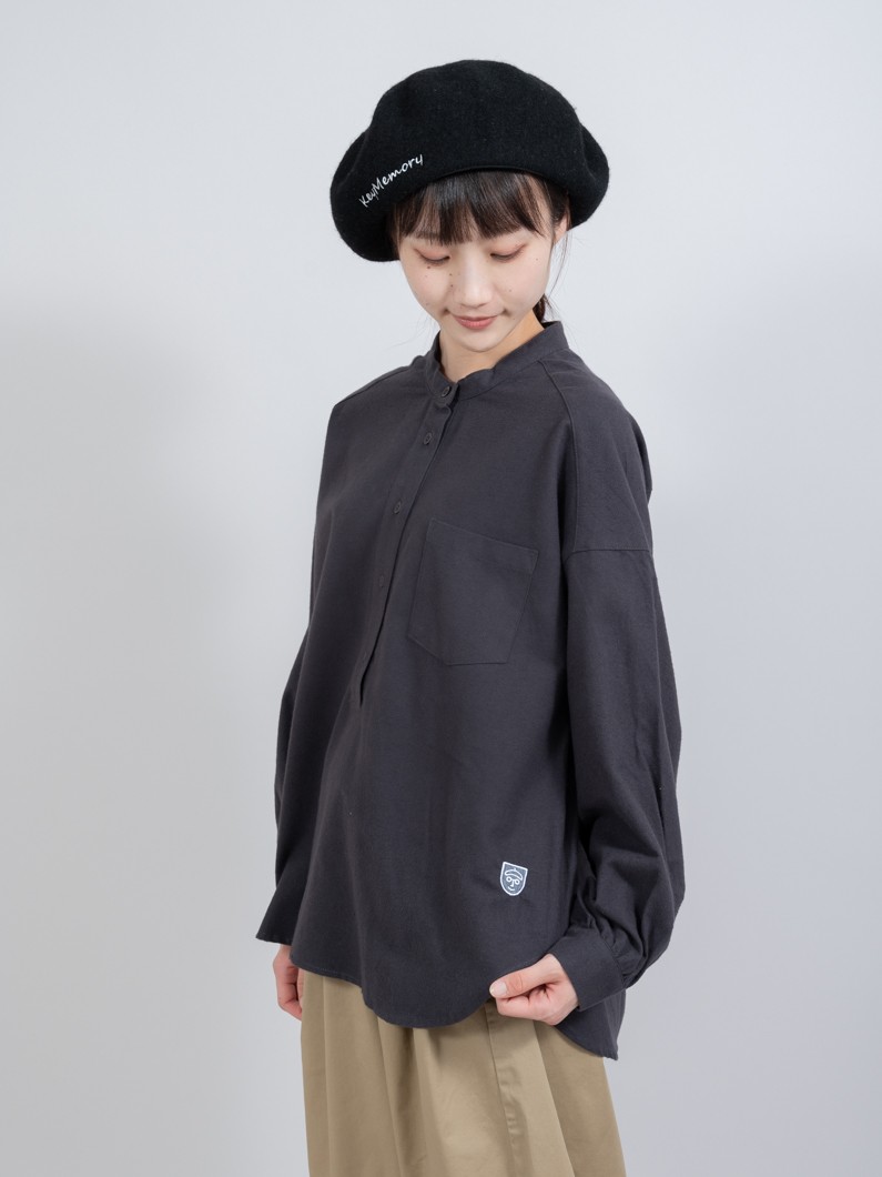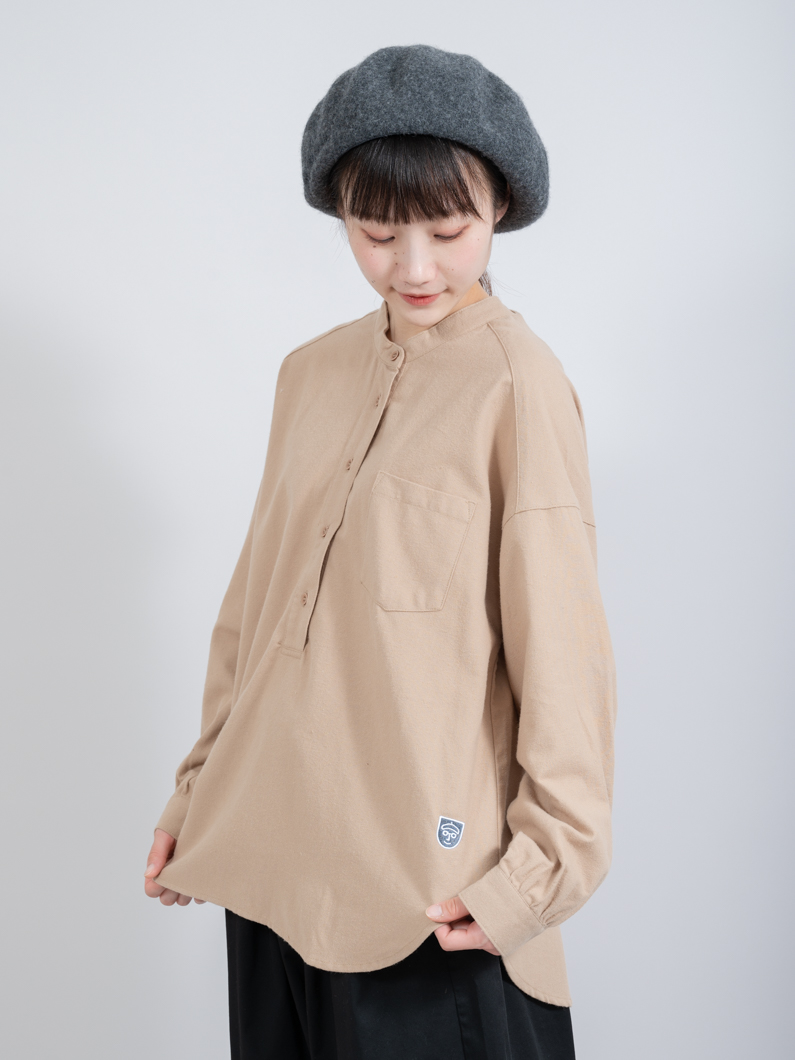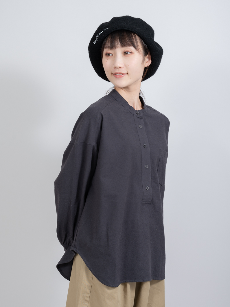 プルオーバータイプのバンドカラー長袖ブラウス。