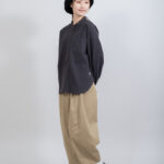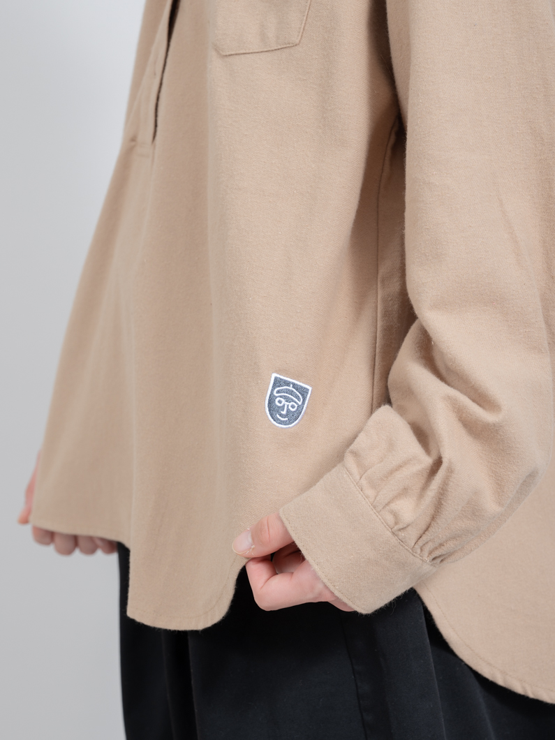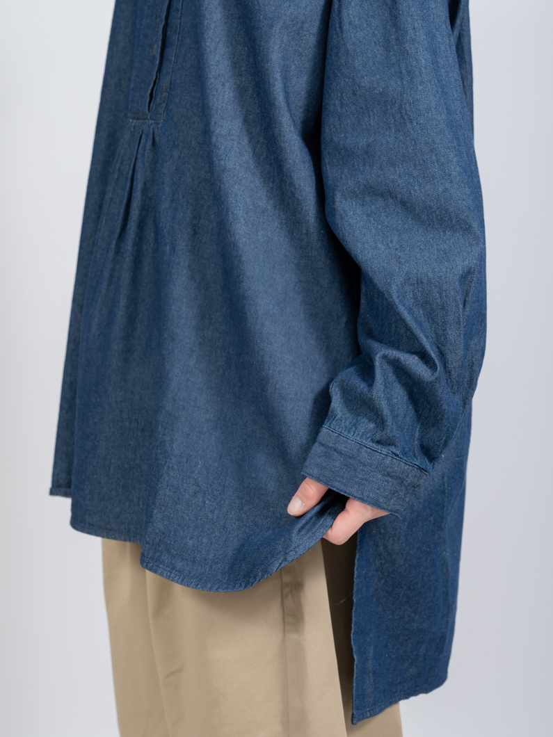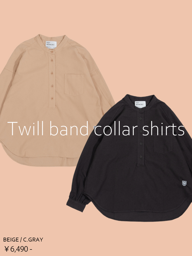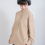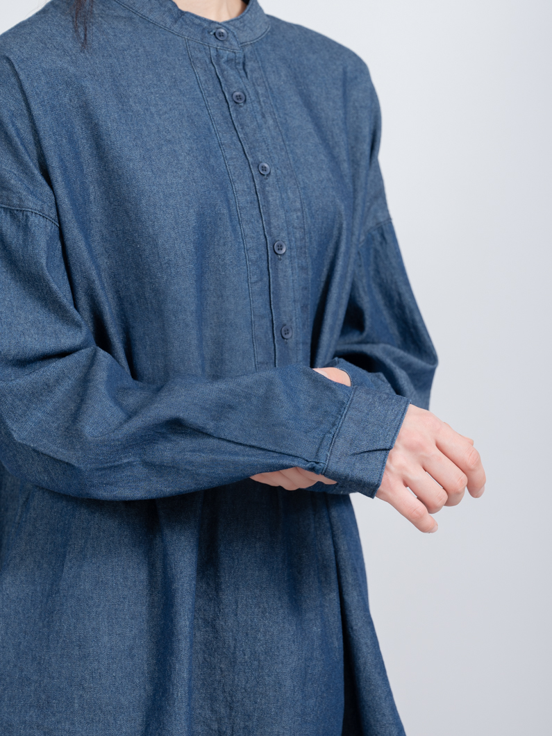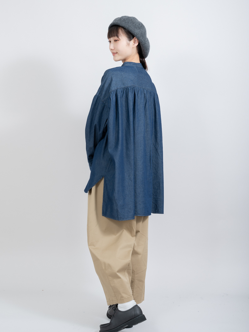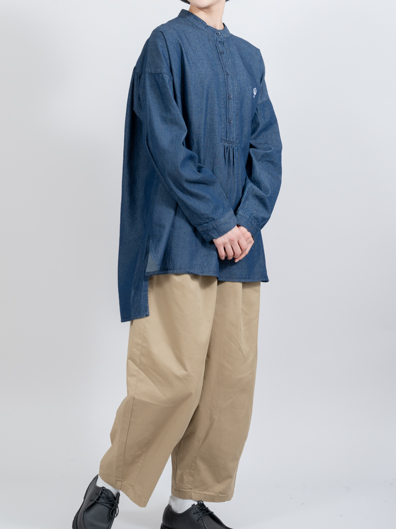プルオーバータイプのバンドカラー長袖ブラウス。