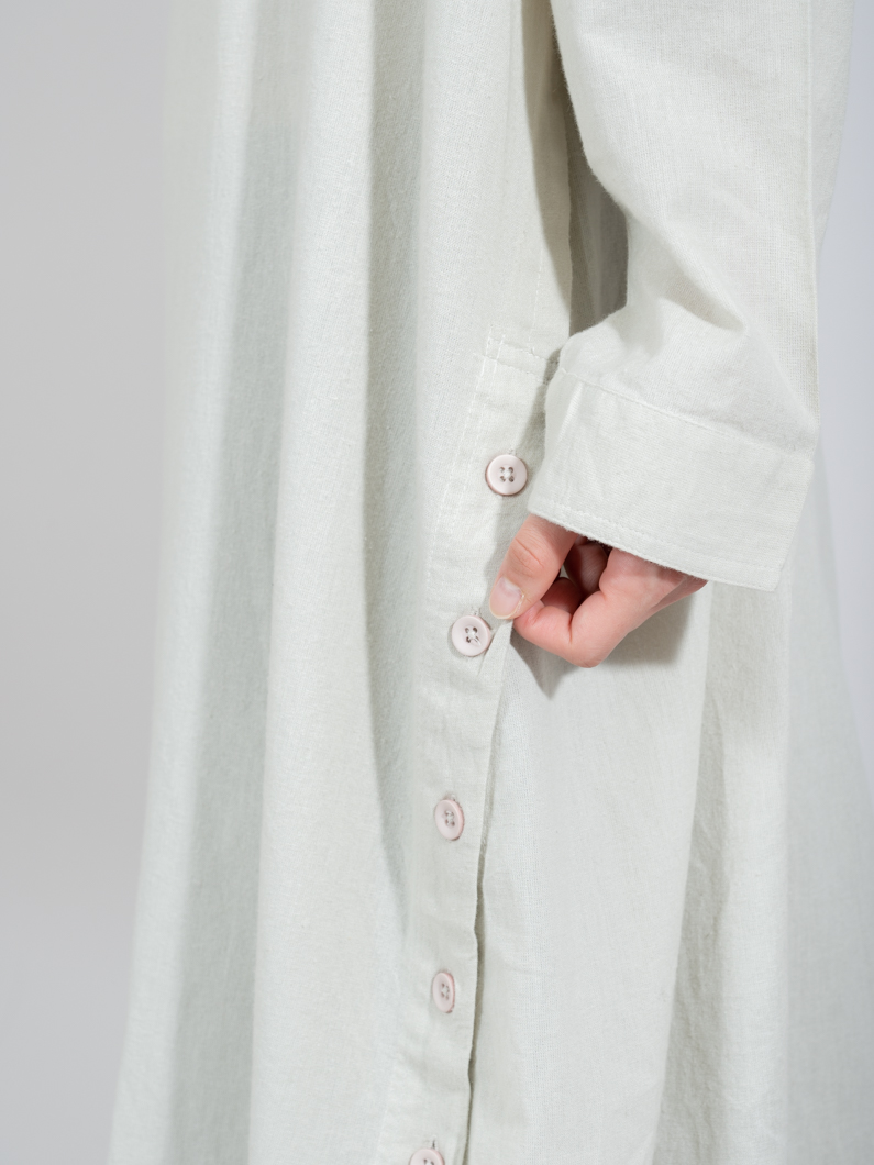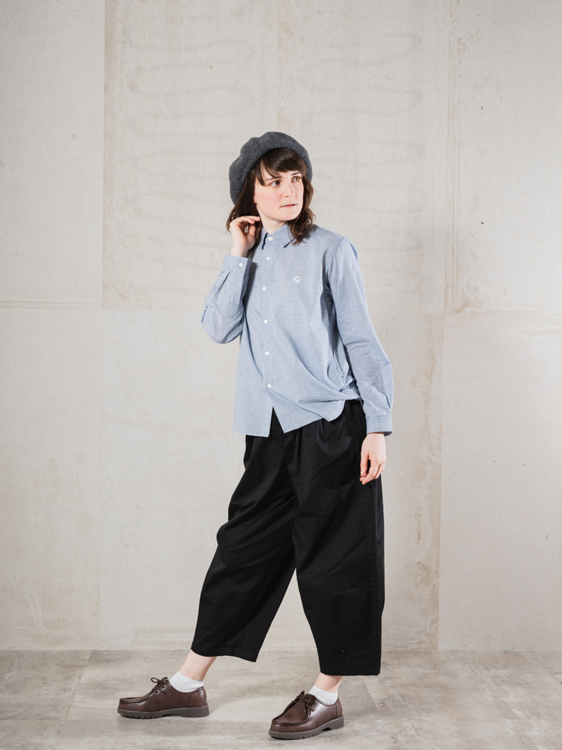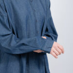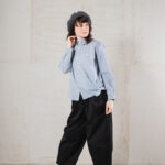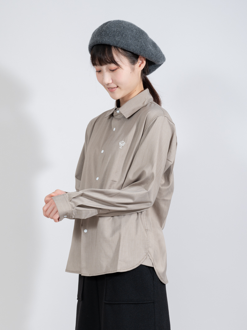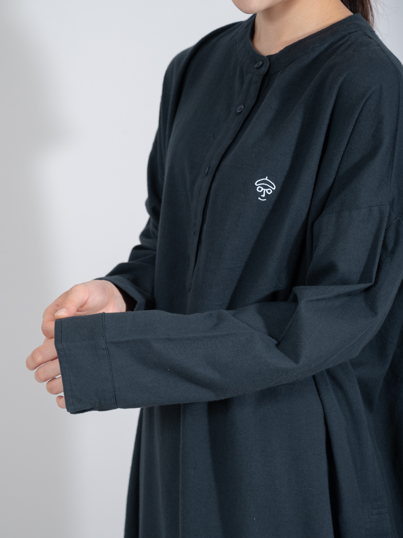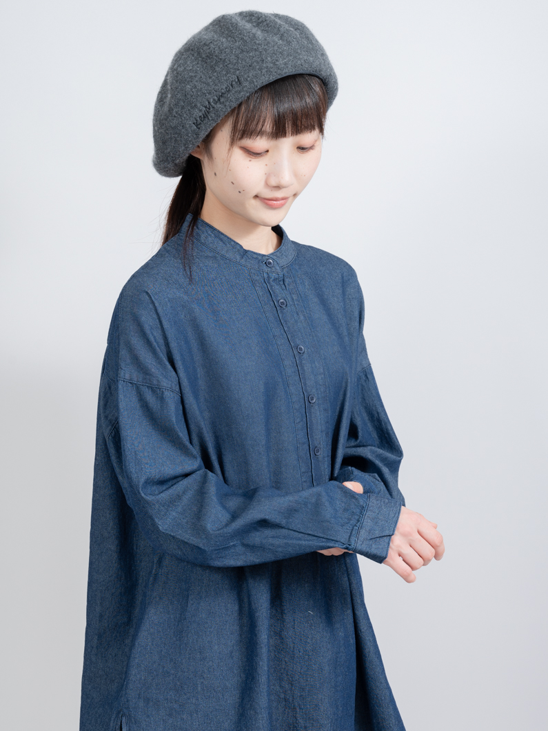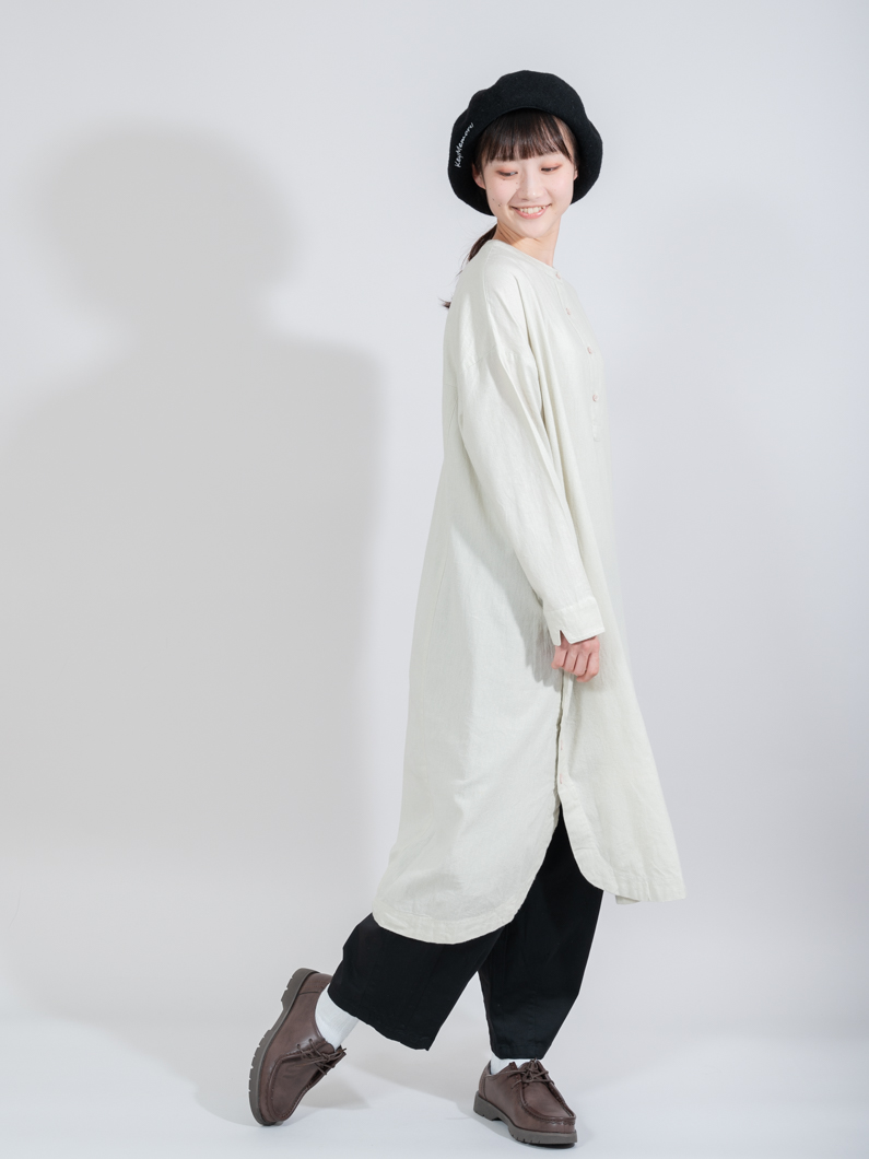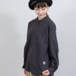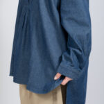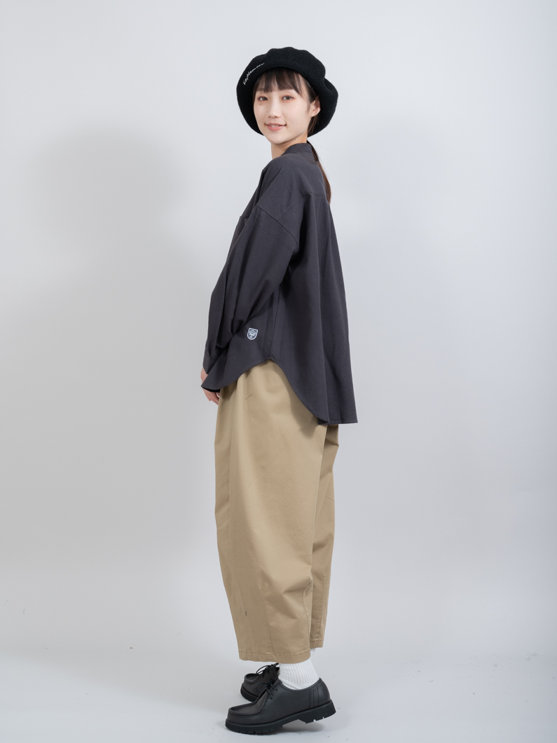 プルオーバータイプのバンドカラー長袖ブラウス。