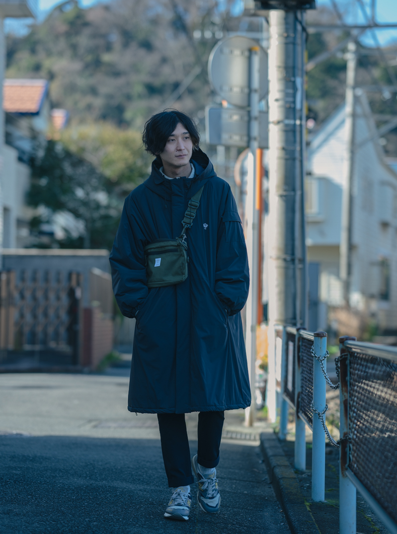 また、先ほどのコーディネートのようにリュックスタイルのときには前を開けて着用するのもおすすめですが、メンズコーデのようにサコッシュや斜め掛けのバッグを持ち歩く際は、前を閉めて着用した方がスタイリッシュに見えたり、バッグのベルトとアウターが絡まる心配がありません。