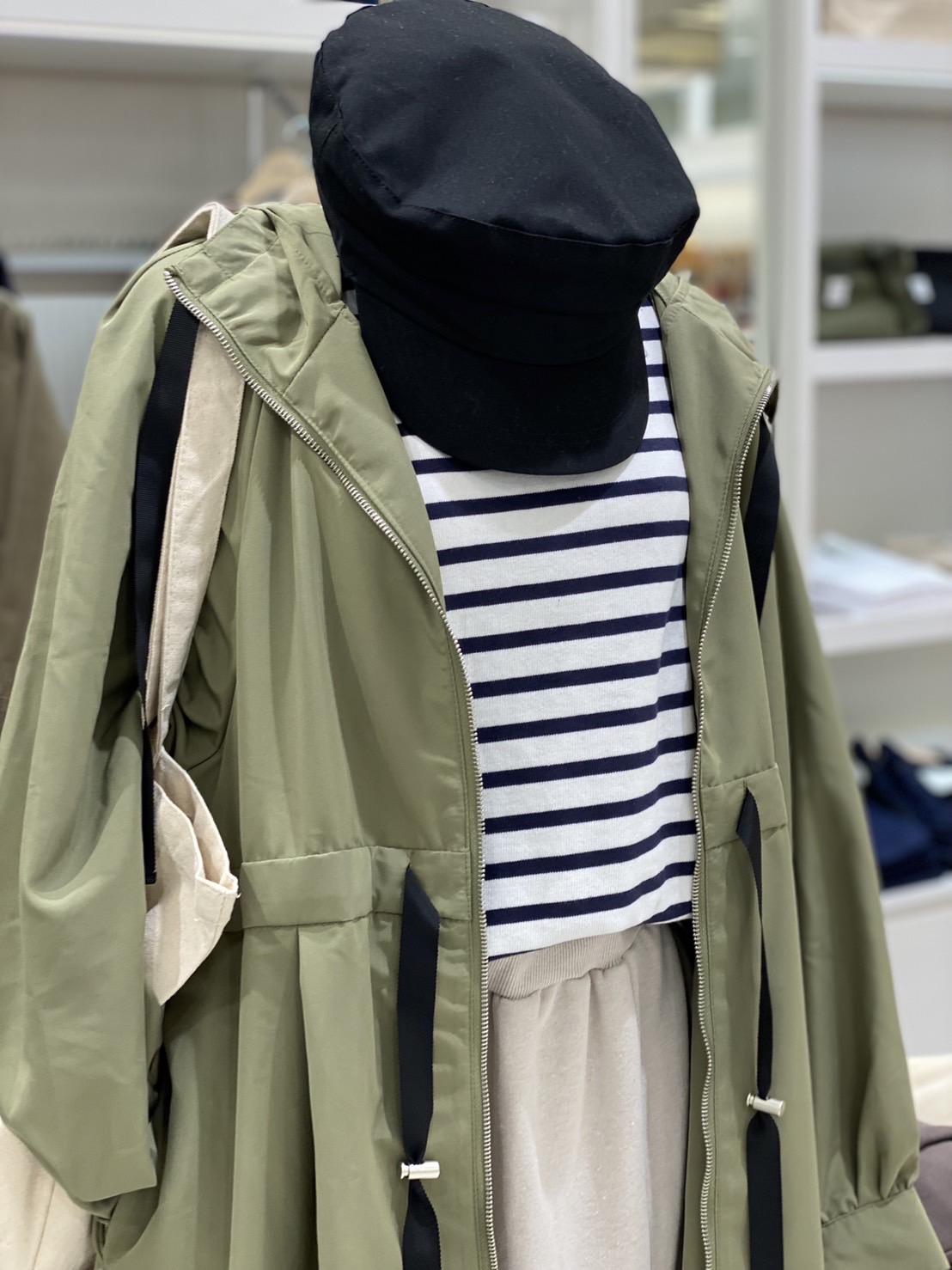 マネキンも春の人気アイテムのロングマウンテンコートと、毎年人気のあるボーダーカットソーを合わせて春夏っぽいコーディネートに。