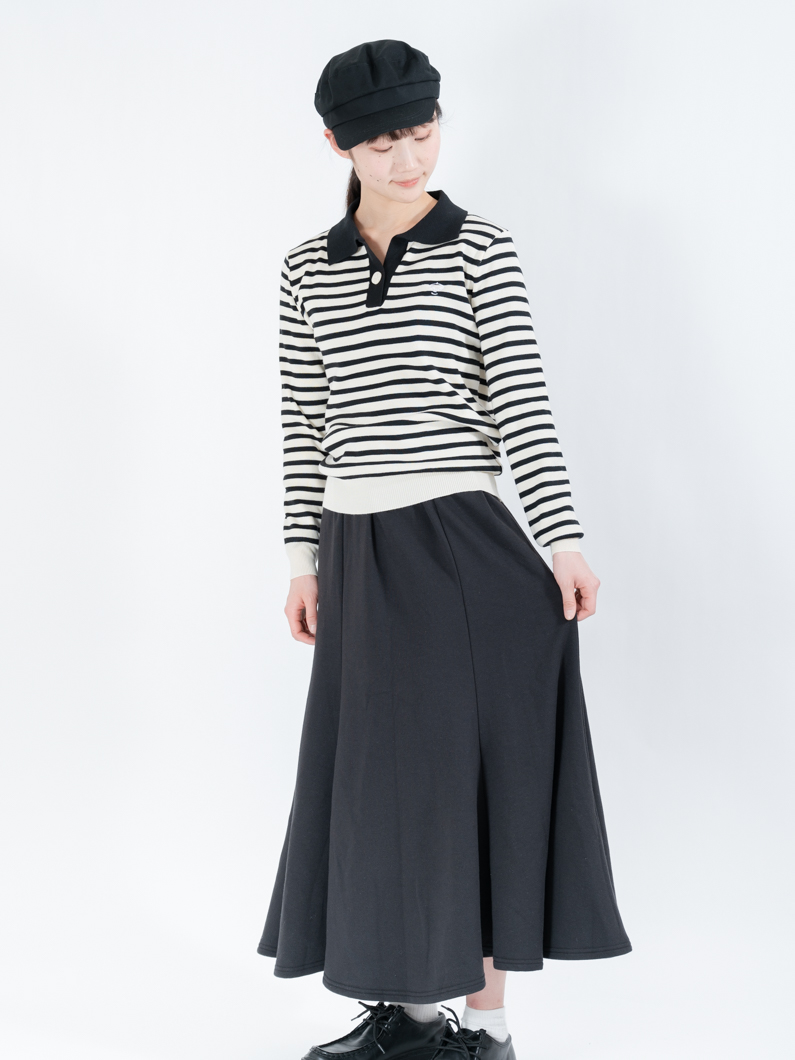 スカートの生地はトレーナーのような裏毛でカジュアル感があるため、きれいめなコーディネートに仕上げたいときには写真のようなハリのあるシャツやカーディガンを合わせるのがおすすめです。