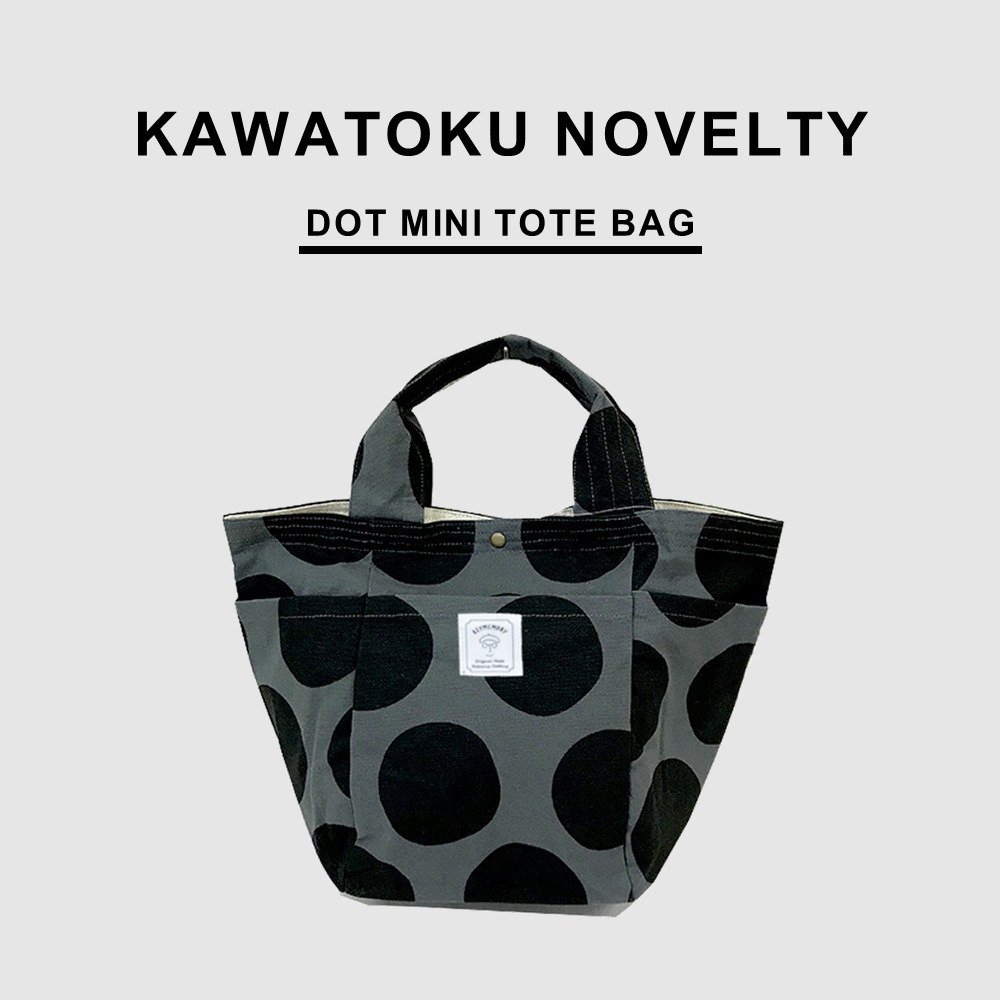 川徳百貨店ポップアップのノベルティは大きいドット生地を使用したミニトートバッグ。底に丸みのあるぽってとしたフォルムがかわいいミニトートバッグ。外側に3つポケットが付いているので収納力抜群のアイテム。ガバッと開ける大口デザインが特徴です。お弁当や水筒、軽めの荷物が入るサイズ感なのでランチトートとしてもお使いいただけます。