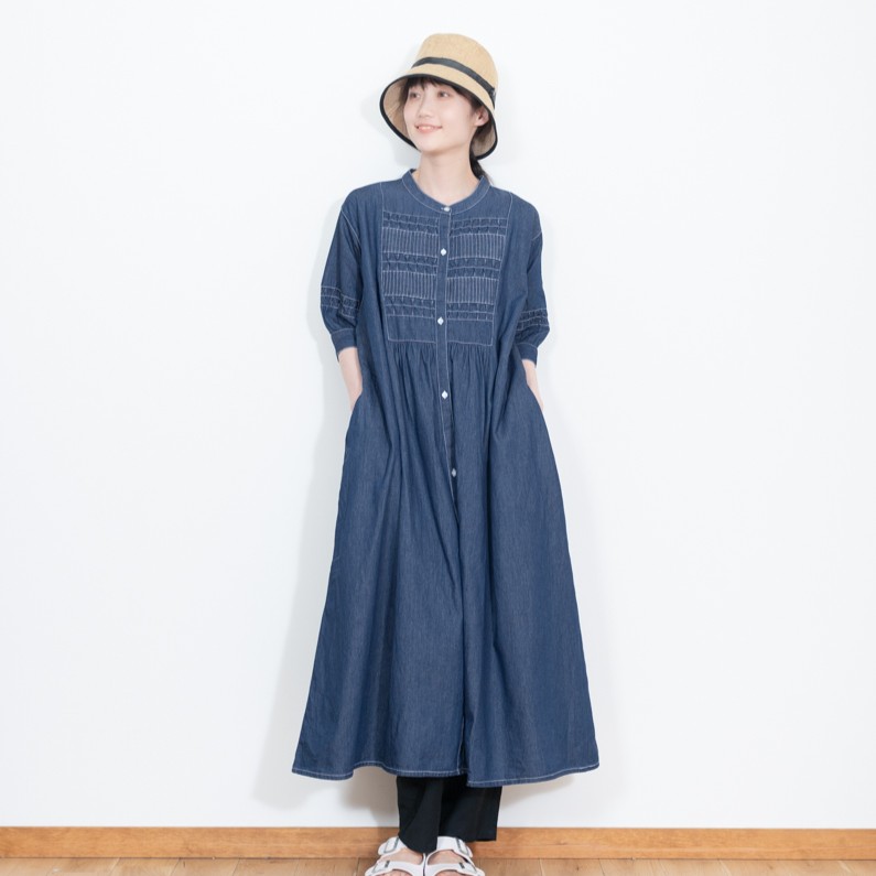 今回の川徳POPUPイベントでは、川徳とのコラボアイテムを限定販売!!(6月6日~発売)胸元と袖口のスモッキング刺繍が印象的な、ノスタルジックな雰囲気のデニムワンピース。軽やかで柔らかなライトオンスデニムを使用し、締め付け感のない美しいAラインを演出します。前開き仕様で羽織としても使える2WAYデザイン。スタンドカラーやふんわり袖で程よい甘さをプラス。春〜秋に活躍する一着で、レイヤードも楽しめます。こちらの商品は数に限りがございますので、お早めに!【KAWATOKU×KEYMEORY 限定デザインワンピース】