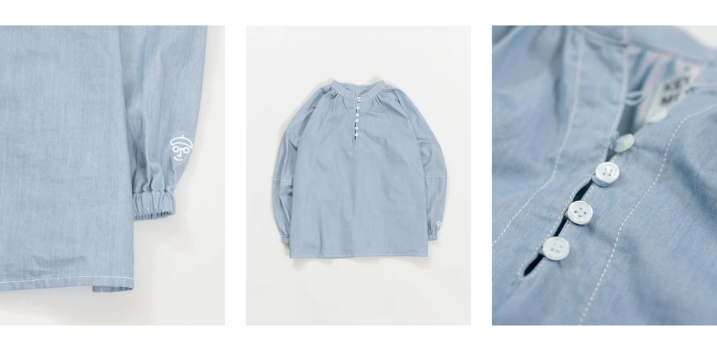 今回はメンズライクになりがちなデニムシャツをふわりとフェミニンな表情に仕上げました。大人気につき、一度完売。再販するも在庫残りわずかなので、ご購入を検討されている方は完売前に是非GETしてください。となっております。たっぷりギャザーを寄せた襟元は、ボタンを全て閉じて、メリハリあるシルエットにしても、ボタンを数個開けて、タンクトップや、タートルネックと重ねて、抜け感を作る着こなしもオススメです。立体的なスリーブは、切替を入れポイントを設けました。袖口はゴム仕様でボリュームのあるパフスリーブながら、手首を華奢にみせ、腕まくりをしたり、