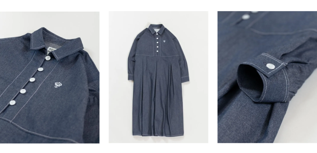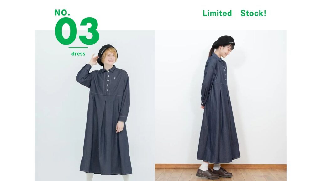1枚で徴用して頂ける様にする為と、立体的なシルエットを出すため、少し生地は厚手になっております。1枚でソックスやシューズなど足元合わせをお楽しみ頂け、冬はインナーの重ね着や、羽織り物との合わせにより、シンプルなデニムアイテムですが、幅広い装いをして頂けます。Dry touch cardiganやDolman sleeve jacketを羽織ったおでかけ春コーデもぜひ楽しみ下さい。