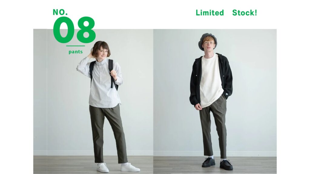 Tapered chino pantsなど合わせたベーシックなパンツスタイルも大変オススメです。