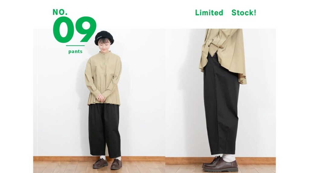 チノ素材でオールシーズン着用できるサーカスパンツはこれまで長く人気アイテムでした。そんなアイテムについてお客様のお声から…サイズはフリーサイズのままで、背面部分にはゴムを入れ、ウエスト両サイドにボタンを取り付けウエスト調整可能にし、インした時におしゃれ見えするようになりました。ベルトループも付いてます。(これまで販売しておりました“Circus pants”(品番:122344/124160)とは若干生地やサイズ仕様が異なります。予めご了承下さいませ。)股上はゆったり深めに取り、裾が少し窄まることで、ワイドパンツよりメリハリがあり、ボリュームのある足元と合わせて頂いてもお楽しみ頂けます。暖かい季節にはロールアップしても雰囲気が変わります。両サイド・背面の計4カ所のポケット付き。透け感も無く、中にレギンスやタイツを着込むことも可能な為、デニム同様オールシーズン活躍する万能ボトムスです。Waist gathers vestをプラスした、きれいめコーデや、Tiered Tunicと合わせ、アクセサリーをプラスした春のお出かけコーデはデザイナーおすすめの着こなしです。