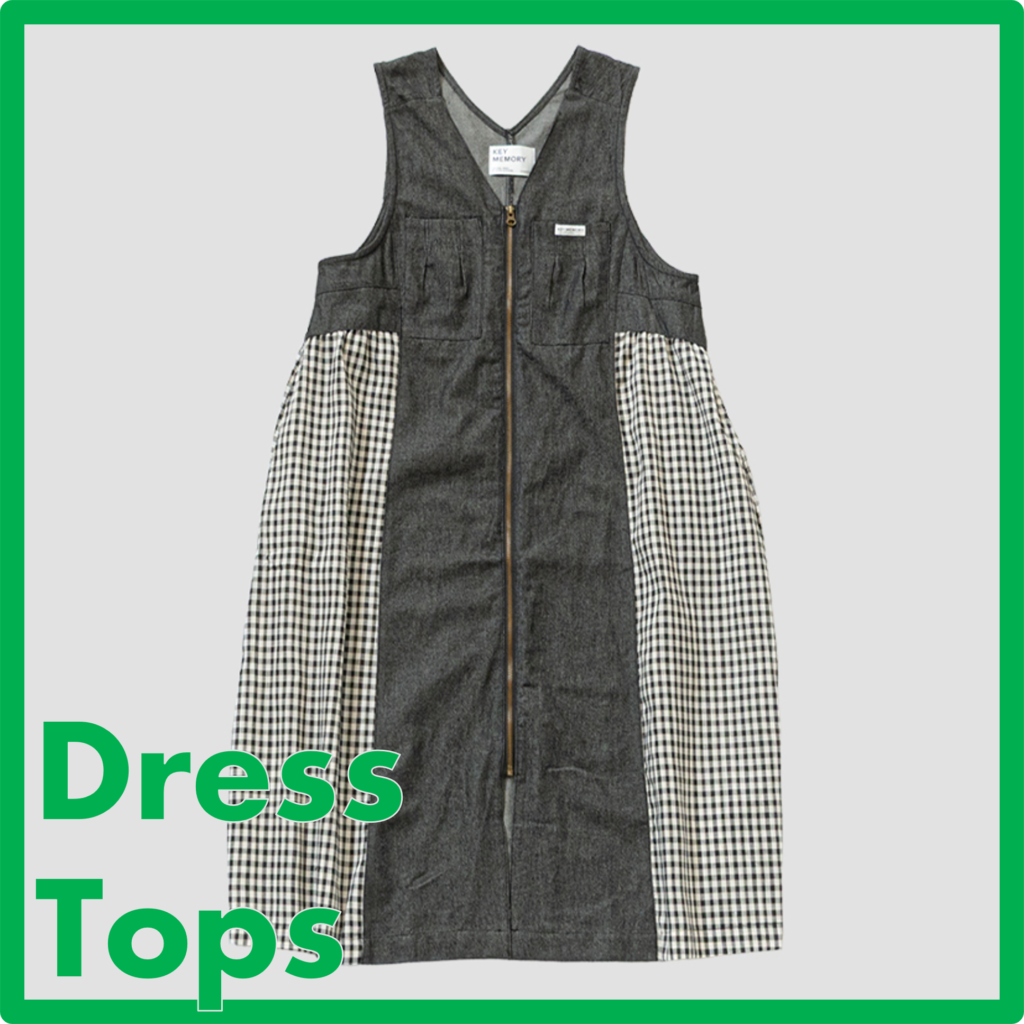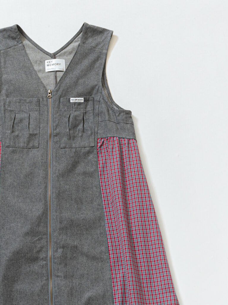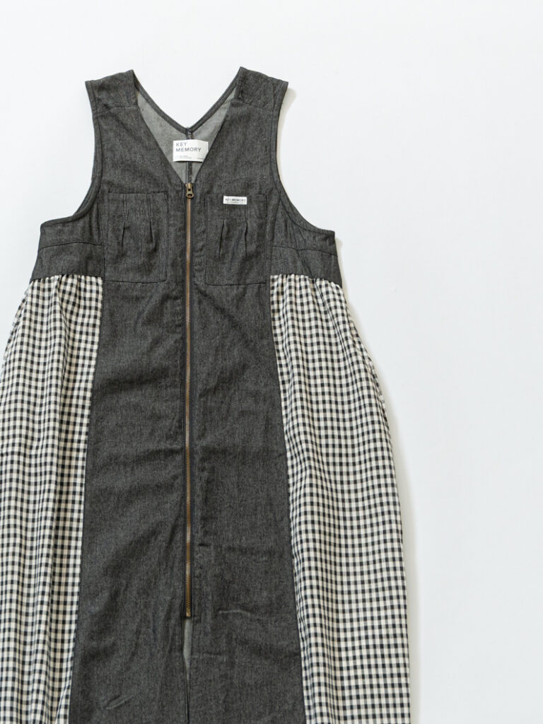 【オンライン限定】ロングジレとしても、ワンピースとしても着られる、スタイリングのアクセントになる1着!Vネックのジャンパースカートデザインをベースに、首元はすっきり見え。ニットやスウェット、Tシャツまで合わせやすいアーム設計で、華奢見えも叶います。フロントジップを開ければロングジレとしても着用でき、動きのある立体的なシルエットに。薄手のデニム生地とシャツ素材のチェック切替で、軽やかな着心地も魅力です。サイドからバックまで続くチェックデザインや、アンティーク調ジップなど細部までこだわったアイテム。