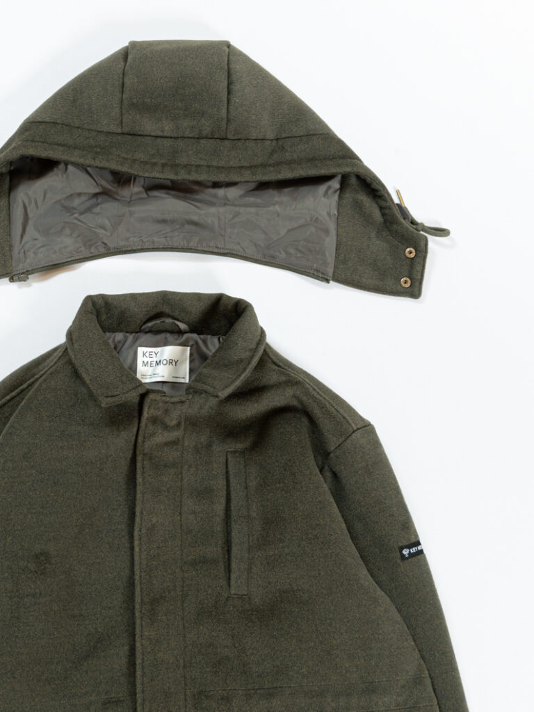 M-65コートをきれいめカジュアルに落とし込んだ、KEY MEMORYのミリタリーコート。定番のM-65デザインをベースに、今回はメルトン生地を採用し、タウンユースしやすい上品な印象に。細かな色味が混ざった表情のある生地感もポイントです。襟付き+取り外し可能なフードはそのままに、シルエットは程よいオーバーサイズへアップデート。襟を立ててスタンド仕様にもでき、雰囲気を変えて楽しめます。ウエストのドローコードや付属パーツにも“ニューレトロ”なこだわりを詰め込んだ、今季らしい1着です。