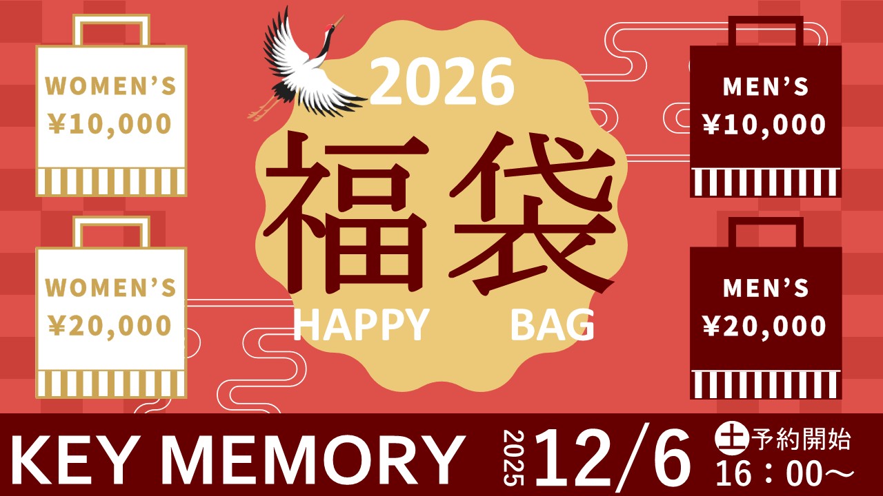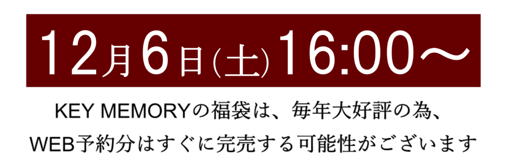こちらも毎年恒例!キーメモリーの公式インスタグラムアカウントで、インスタライブ2026福袋予約販売直前スペシャルを、2025年12月6日14:00~配信いたします!インスタライブ内では、福袋の確定目玉アイテムのご紹介や、中身の内容などをコッソリご紹介!是非お楽しみに!