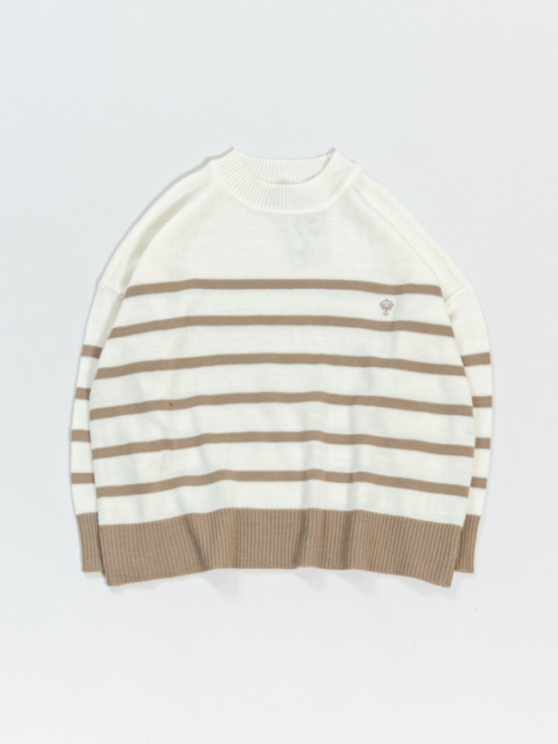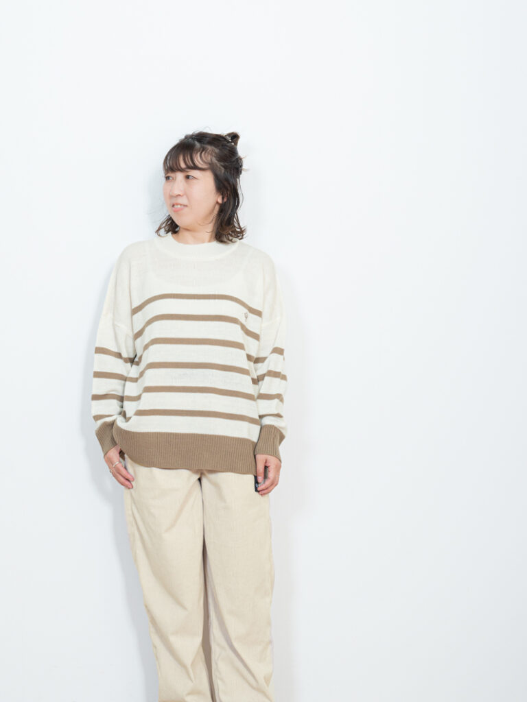 2026年福袋限定!レディース福袋2万円コース確定で入っているアイテムは、先程紹介した「ボアジャケット」に加えて、インナーにぜひ合わせていただきたい「ボーダーニット」が確定で入っています!KEY MEMORYで人気のボーダー。今回は全面にボーダーラインを入れず、さりげなく、すっきり見えする大人ボーダーデザインでご用意致しました。柔らかいBEIGEカラーのラインは、モノトーンでもカラーアイテムでもぴったり合わせやすい色合いを選んでおります。首元は白で明るさも出せるようなラインバランスです。袖口と裾部分はラインの幅を広げ、メリハリを付けました。ライトな厚みのニットを使用し、ボアジャケットとの素材感の違いを出しております。アクリル素材で軽く、編地もスッキリしております。サイズ感は、幅広いデザインのボトムスともバランスが取りやすく、すっきり見えするようなサイジングになっております。メンズ福袋アウターとのアースカラー合わせもピッタリですのでぜひ合わせてご覧下さいませ。