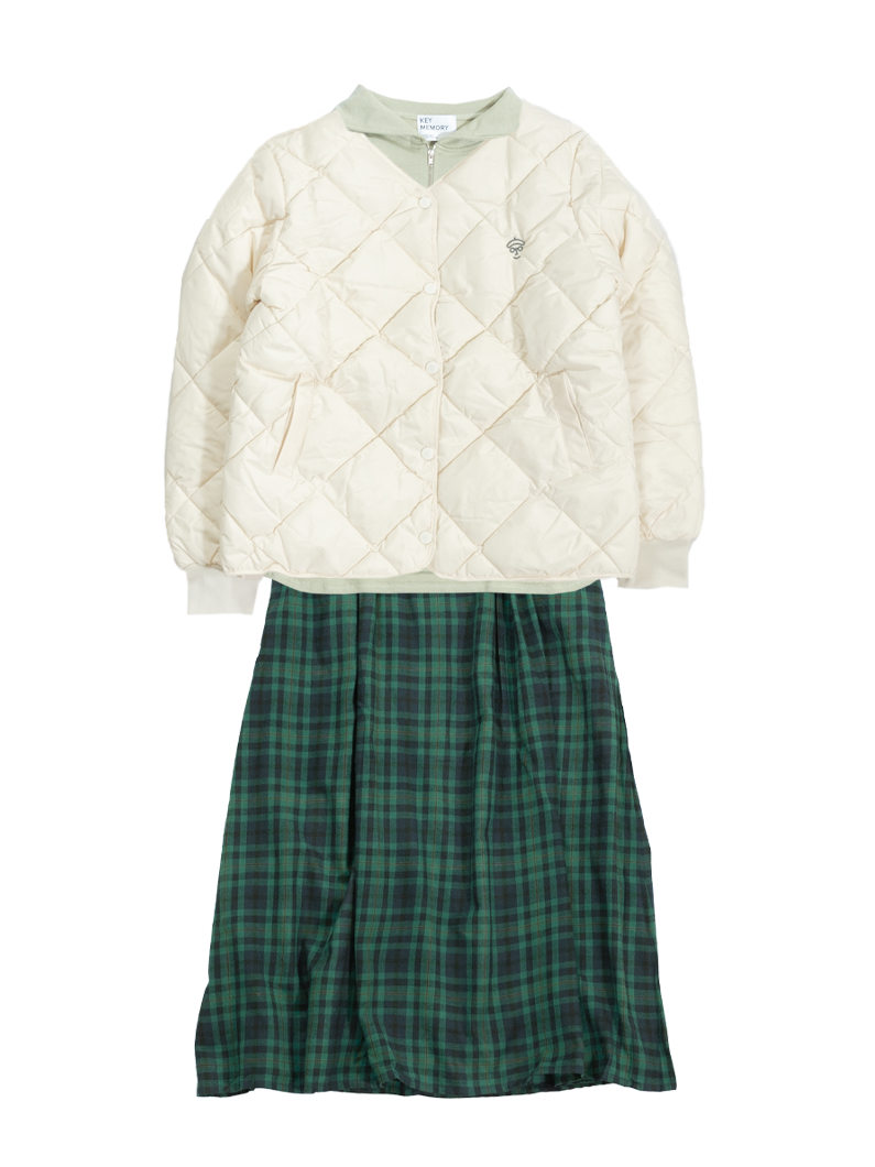 緑のチェック柄のスカートは他の人とも被らず、可愛くなりすぎないため、実は何にでも合う優れもの!