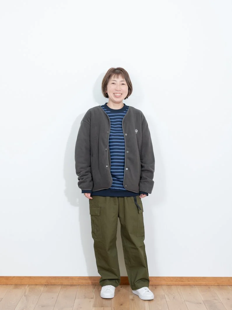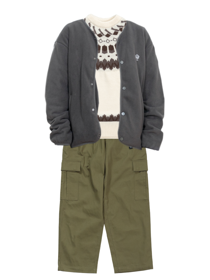 アウターを脱いでもトーン違いの緑で統一感があり キマる コーディネートです。