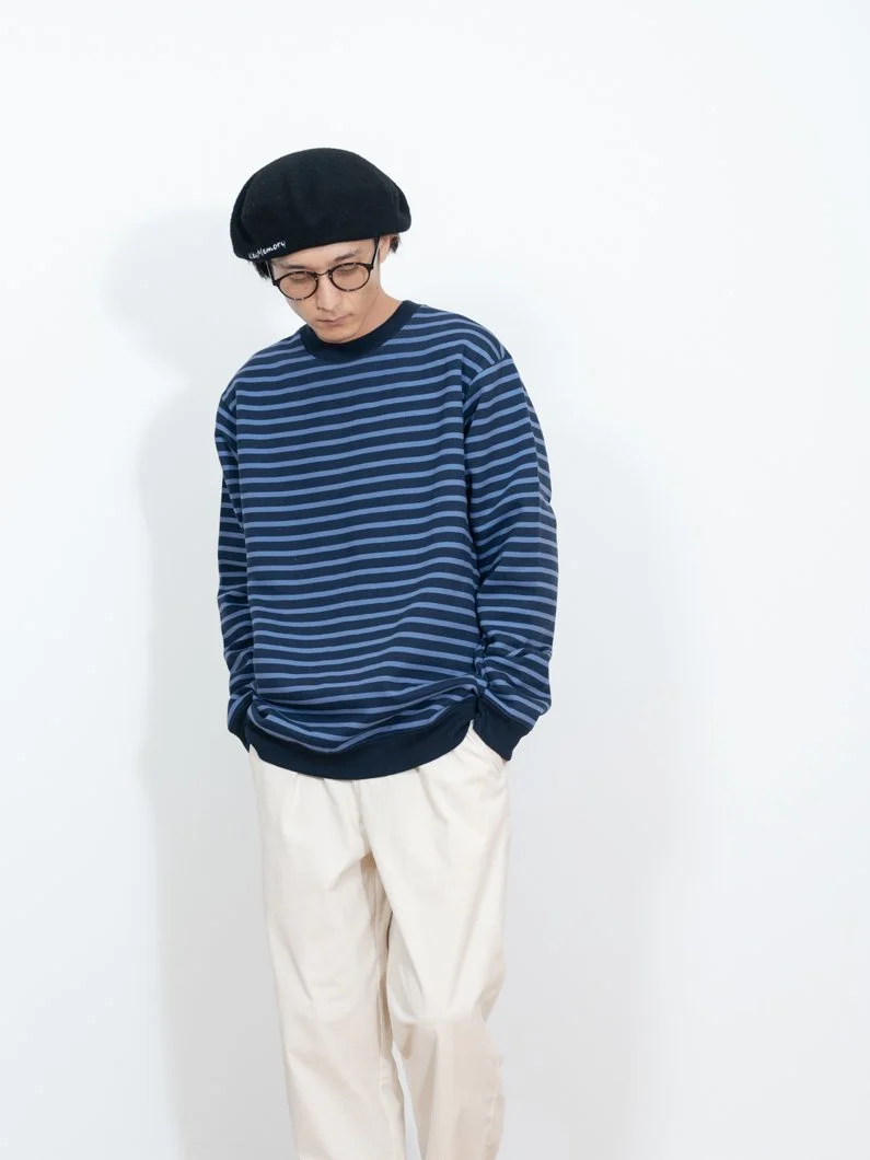 トレーナーに使用されているボーダー柄はカジュアルになりやすいですが、使用する色を2色にすることで統一感がでて落ち着きのあるコーディネートに仕上がります。