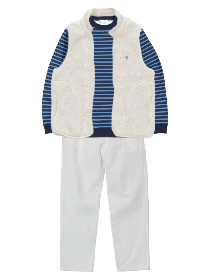 またボトムスの色もベストと合わせることで、より縦に目が行きやすくなり、気になるお腹周りが目立ちづらくなります。