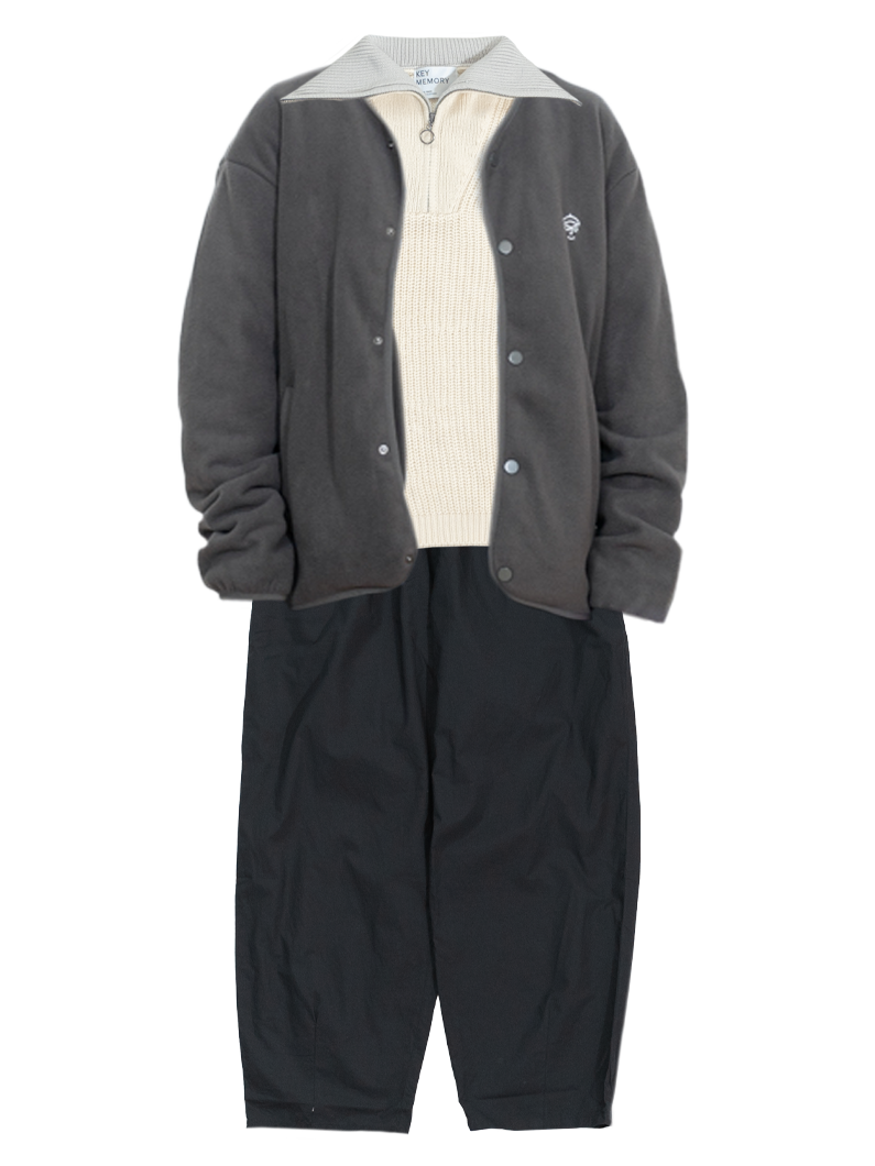 シンプルなデザインのアウターなので、特徴的な大きな襟元のニットをプラス。襟部分の裏側がグレーなので、アウターのグレーとリンクして統一感がでます。