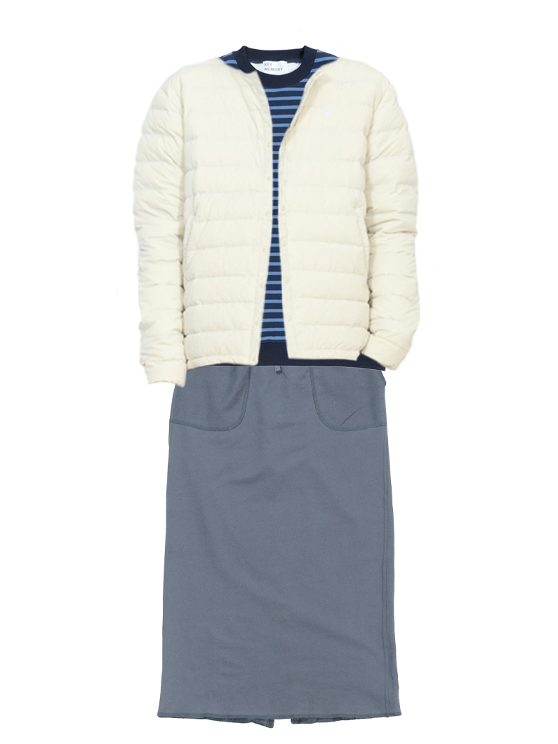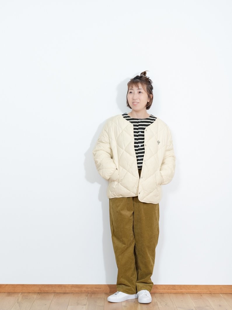 ジャケットには、ダウン70%を詰めておりますので、保温性もあり暖かく、軽い着心地で着用していただけます。ショート丈ですっきりバランスも取れ、ちょっとしたお出かけや車移動でも動きやすくておすすめです。