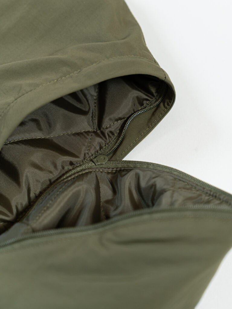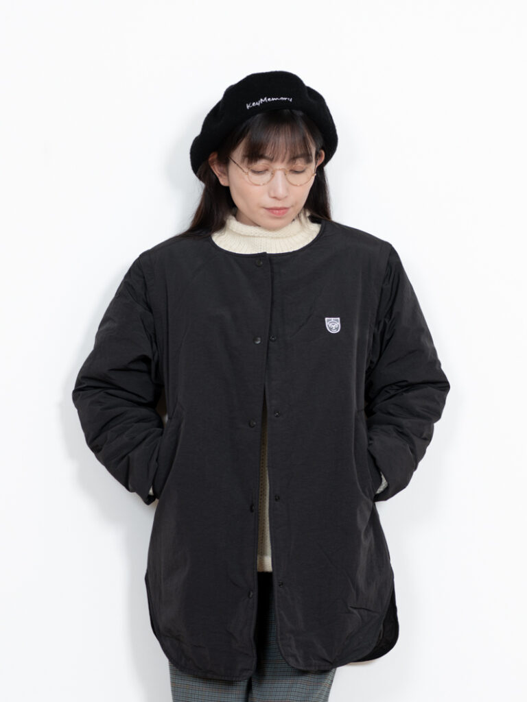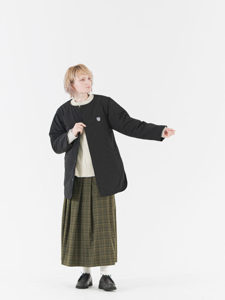 キルティング部分はつるっとした素材感なので、ニットやスウェットを重ねても動きやすく、ストレスなく暖かくお過ごしいただけます。