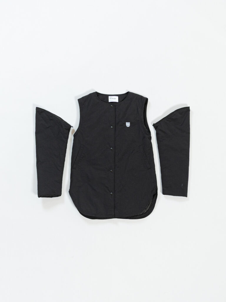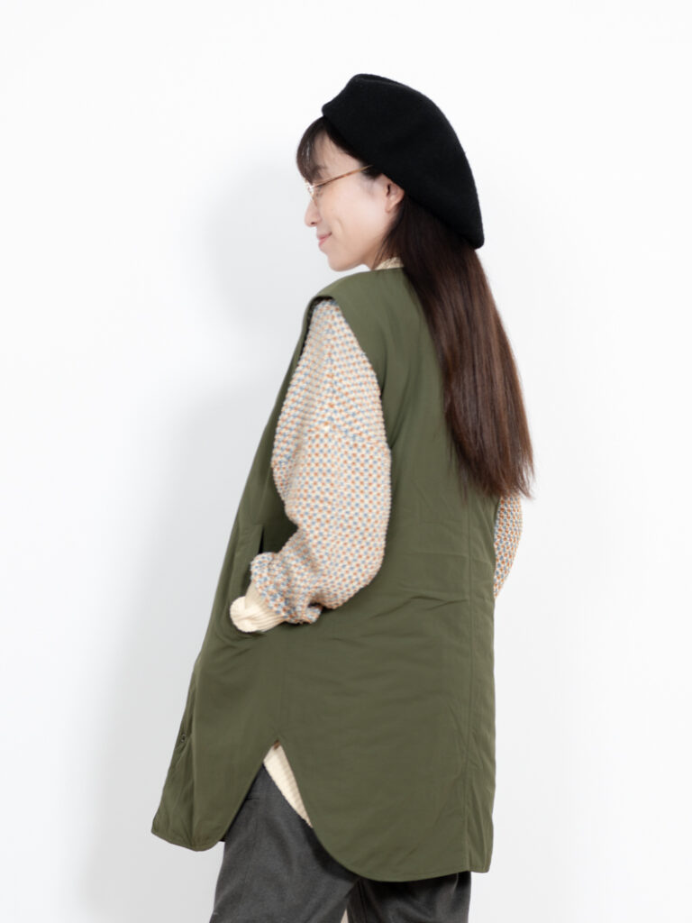 ベストにした時も、ヒップ周りはしっかりカバーしつつ、肩回りのカットや全体のバランスを何度も調整したこだわりのシルエットです。