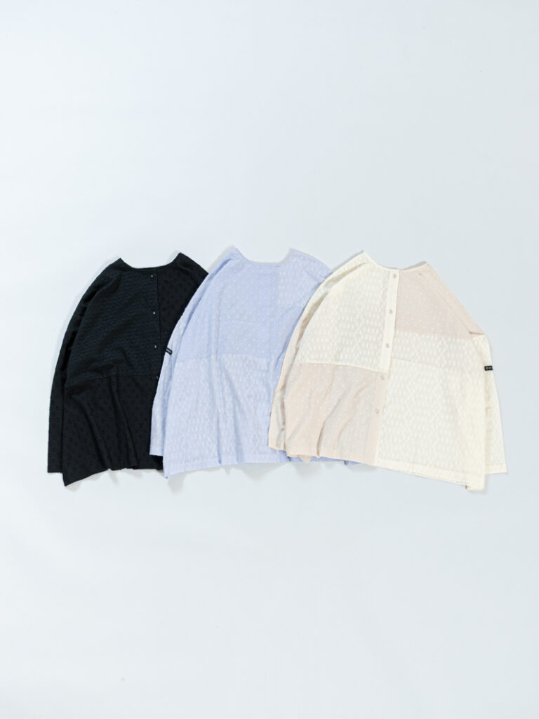今の季節はボタンを開けて半袖のTシャツやワンピースの上にさらりと羽織って。肌寒くなってきたら前後を反対にして、ニットの下に重ねて。前後2way&羽織にもなる万能ブラウスです。