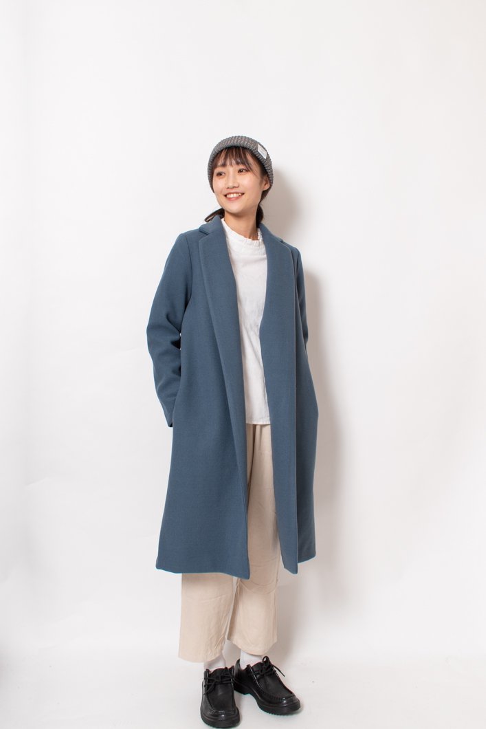 光沢感のあるメルトン素材のチェスターコートは、ブルーグレーの落ち着いた色味が美しく、光沢感もあることからきれいめカジュアルファッションに最適。