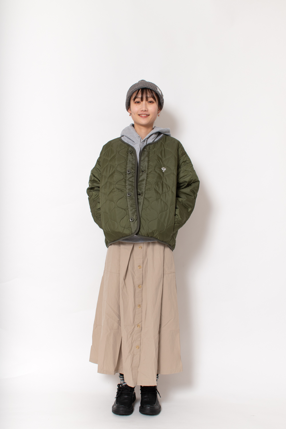 カーキカラーは合わせにくいと考えることも多いですが、カーキが落ち着いた色味な分、中にはホワイトやオレンジ、ベージュなどの明るい色のものを合わせていただくと春先でも着こなしていただきやすいです。