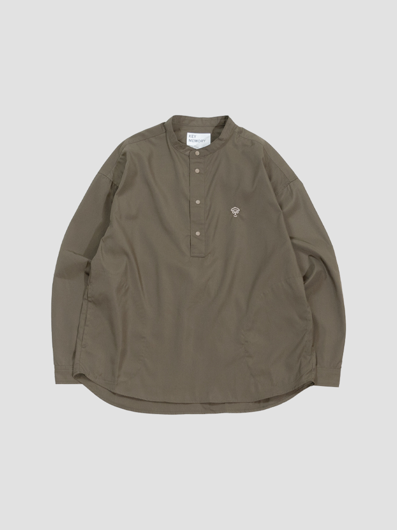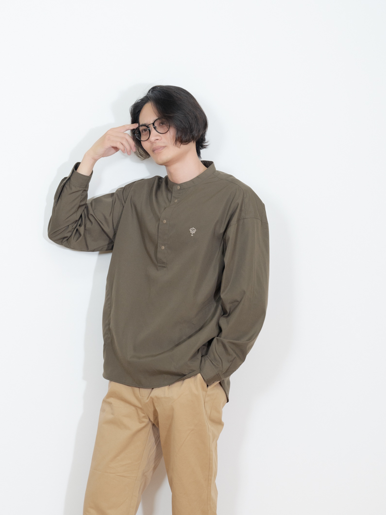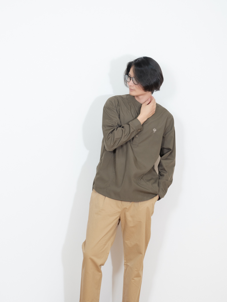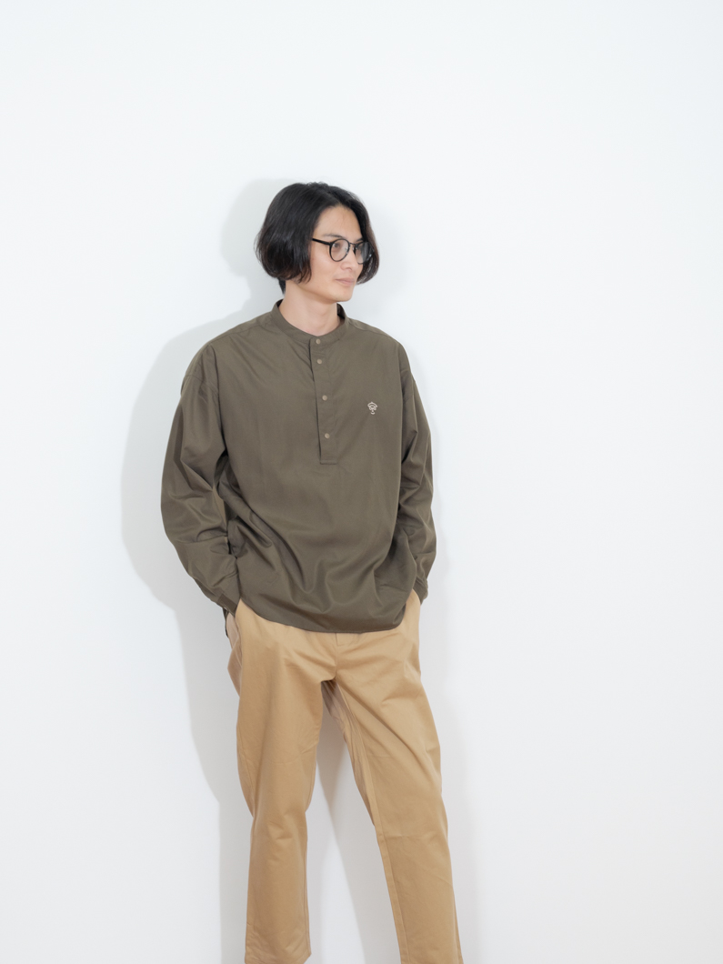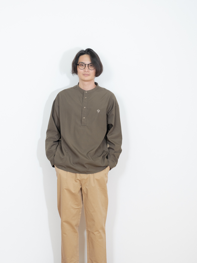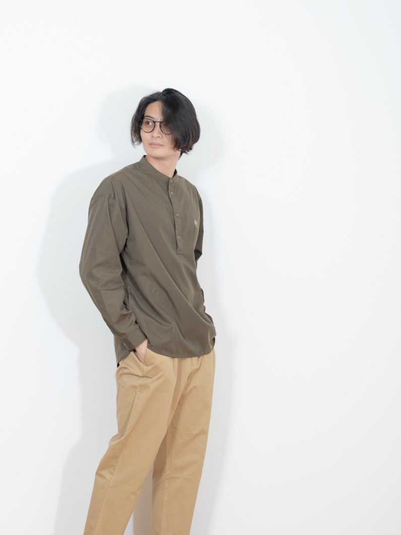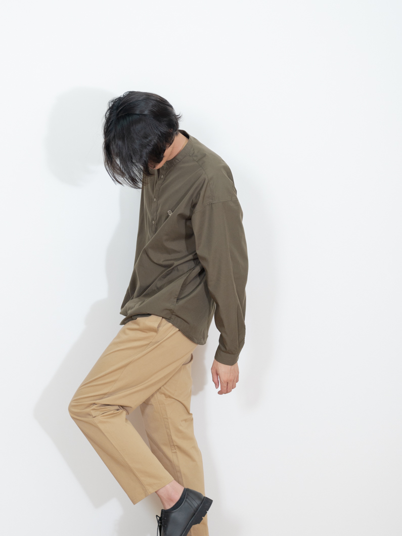 Band collar snap shirts KHAKIを使用したコーディネート。