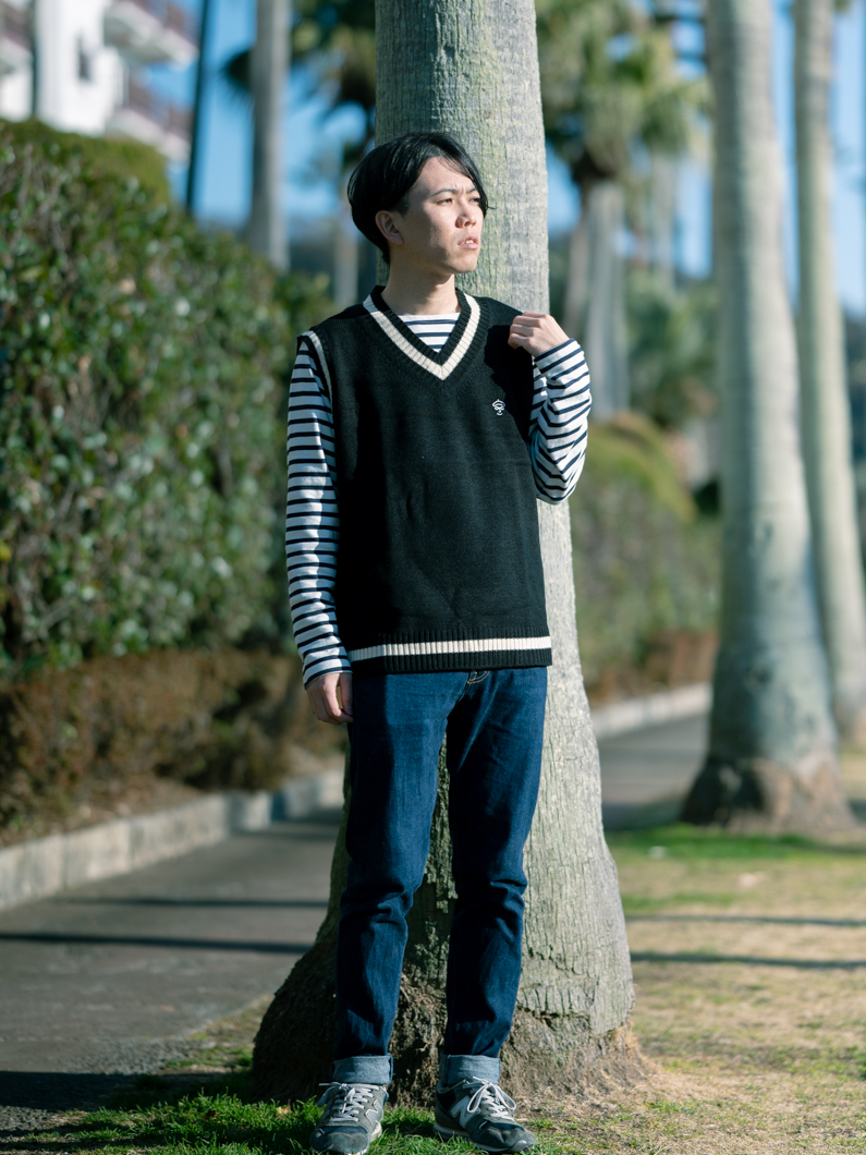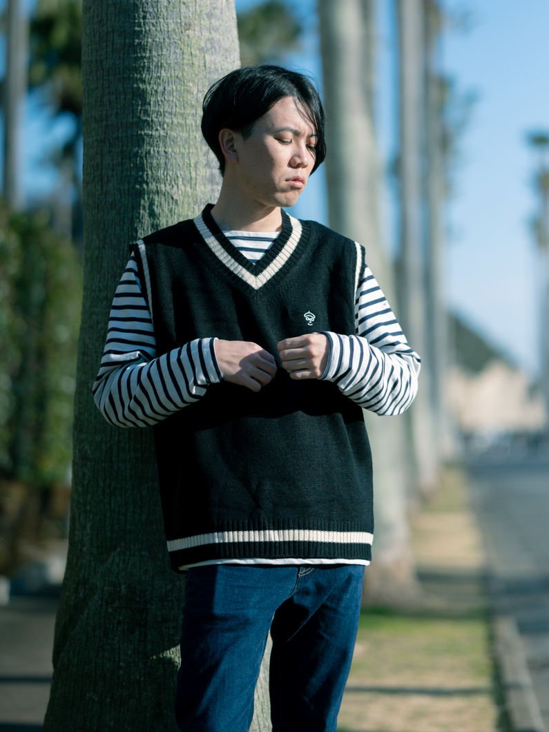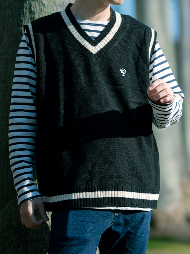 Childen knit vest BLACKを使用したコーディネート。