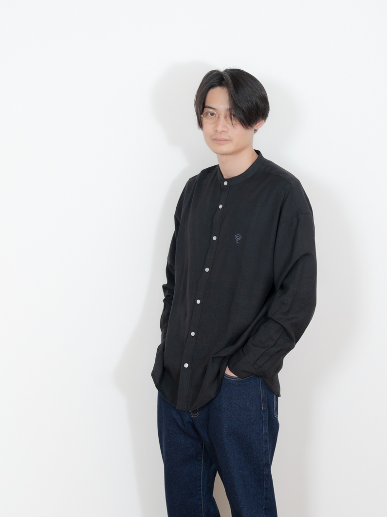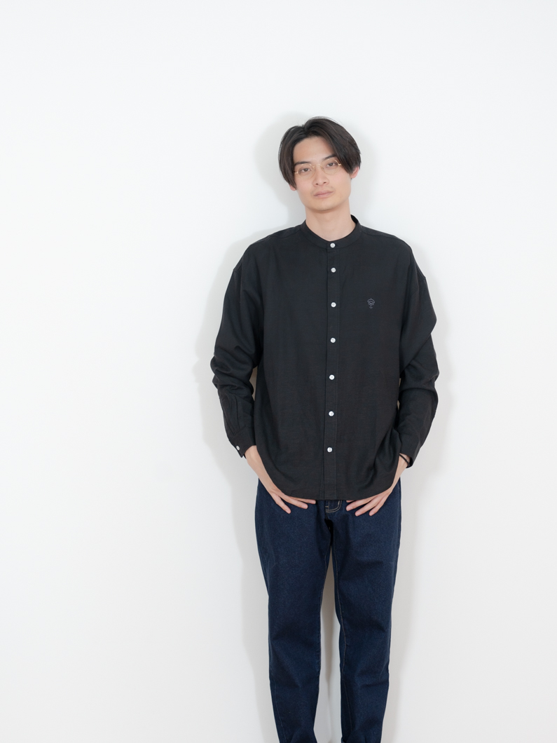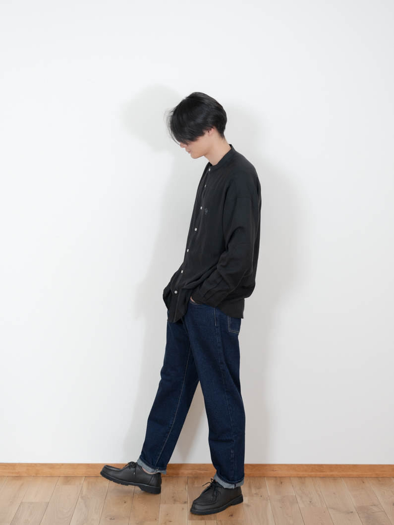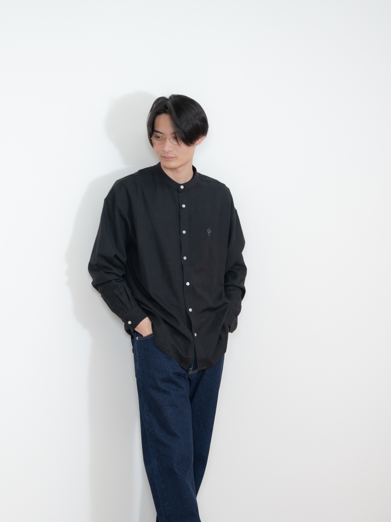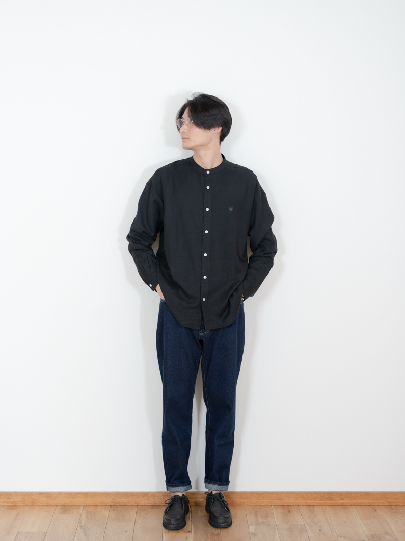 Linen bandcollar shirts BLACKを使用したコーディネート。
