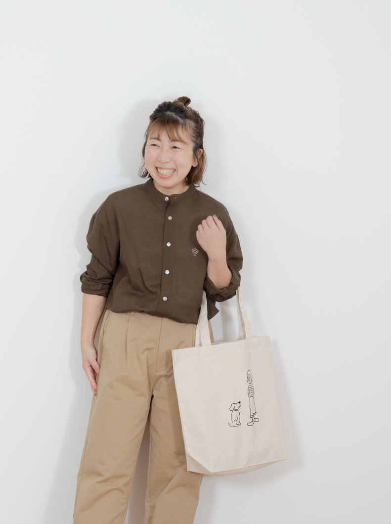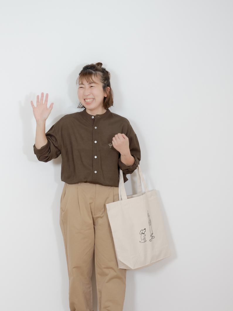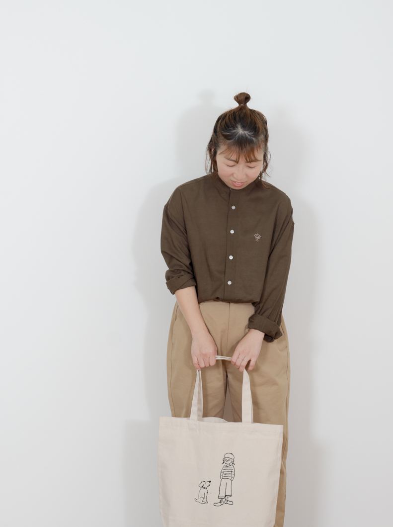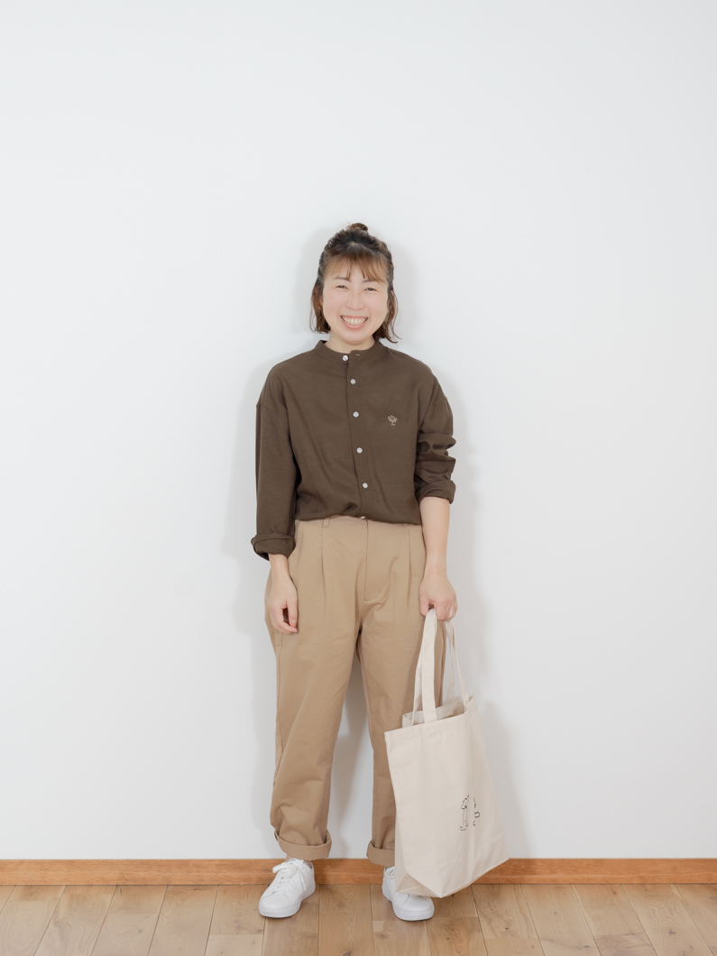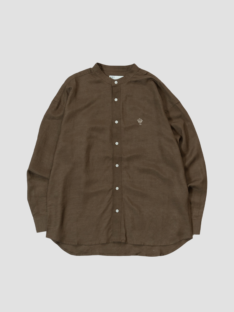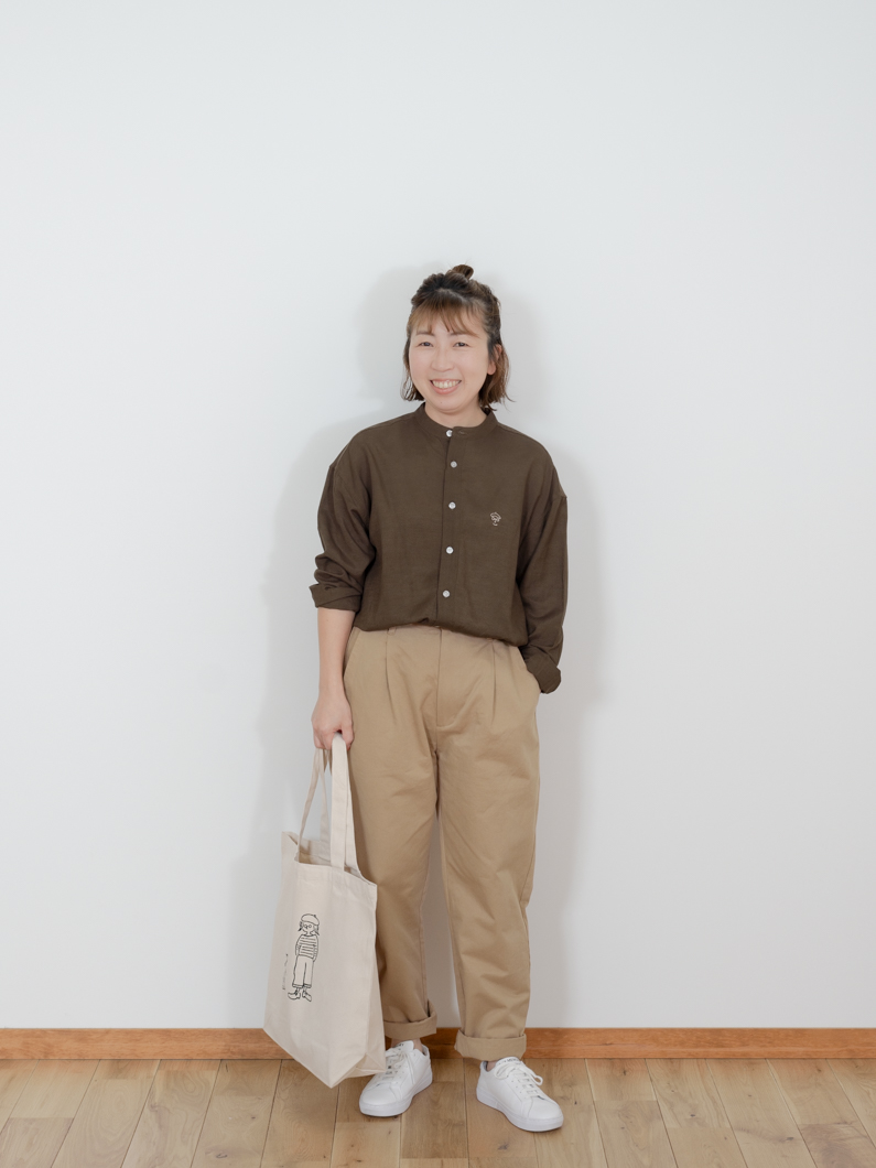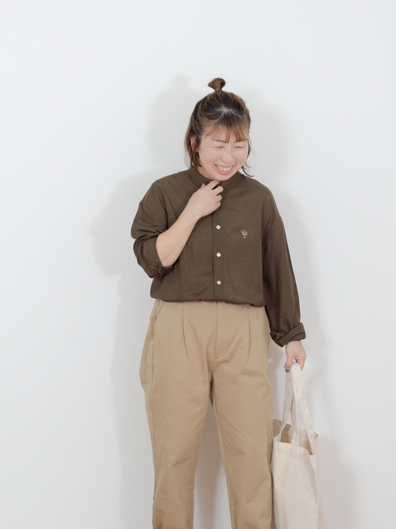 Linen bandcollar shirts BROWNを使用したコーディネート。
