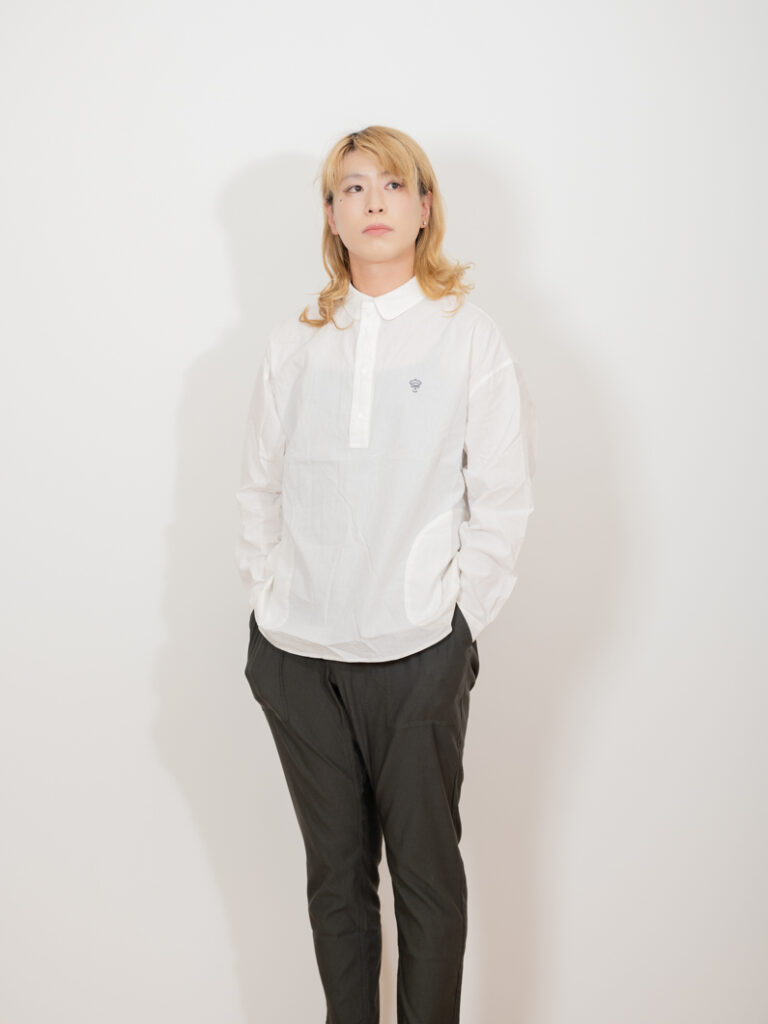 Snap pullover shirts WHITEを使用したコーディネート。 STAFFかねがえ 180cm