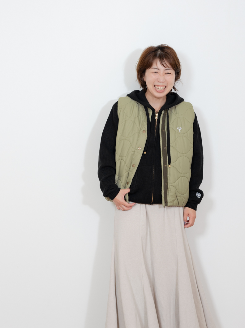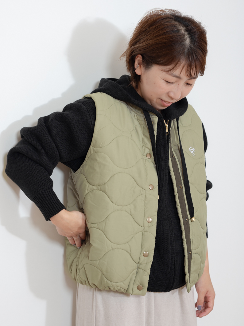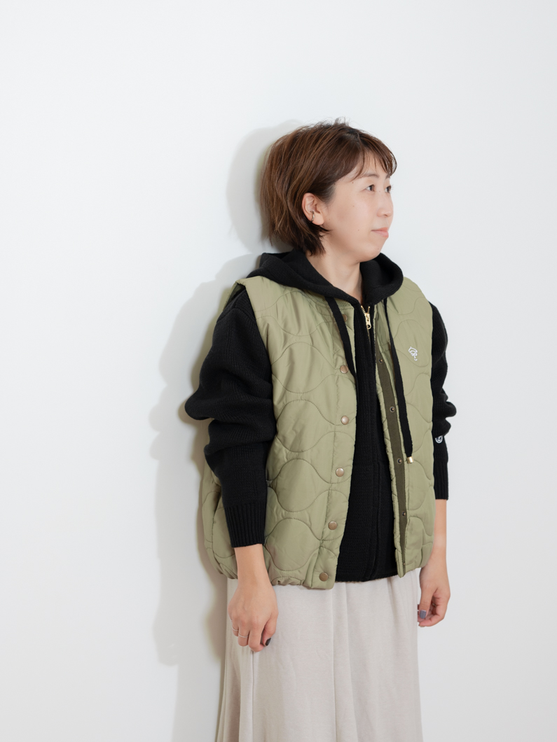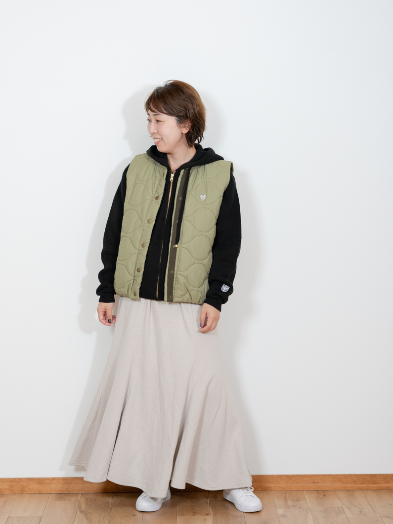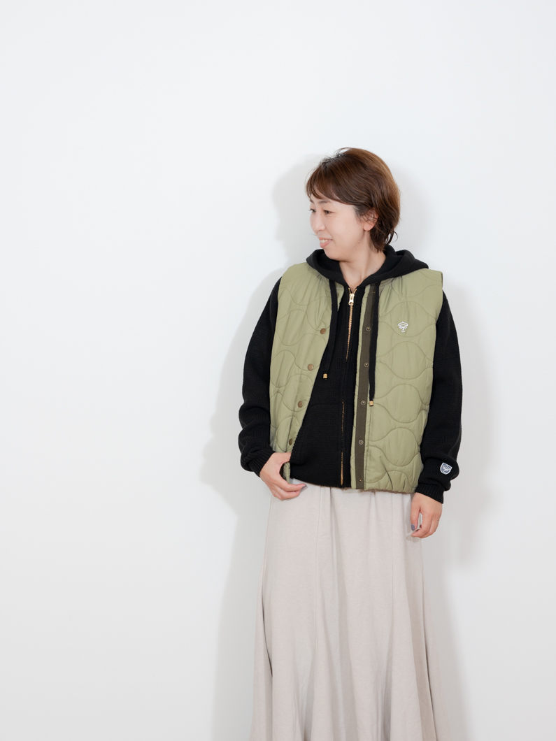 Fleece quilt jacket OLIVEを使用したコーディネート。