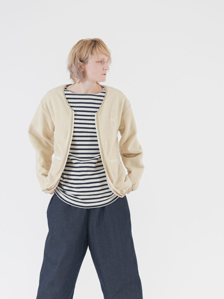 寒い日は一気にチャックをしめて、暖かい日はボタンで上だけしめてTOPsをのぞかせる等、様々な着こなしでお楽しみいただけます◎