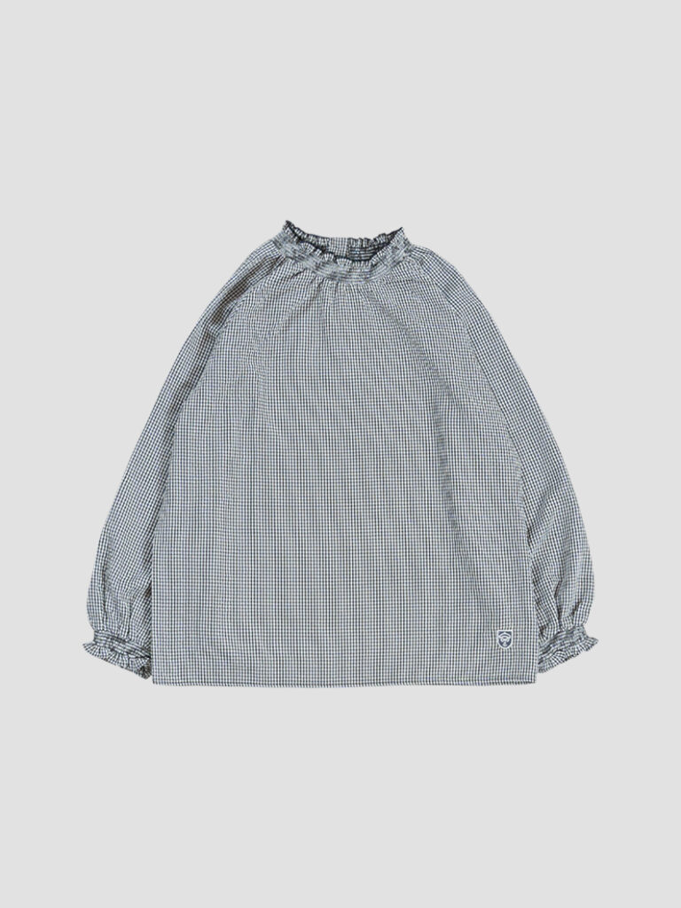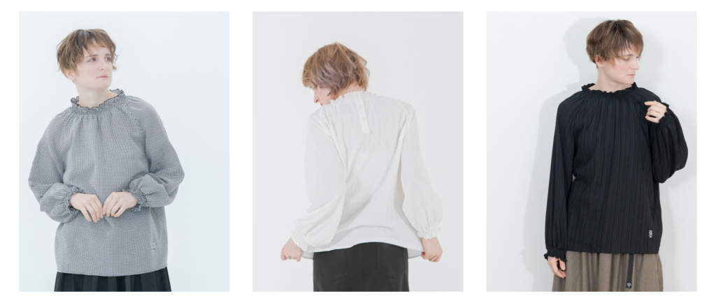 襟部分はギャザーとフリルデザインで、あまり高さを出し過ぎず、