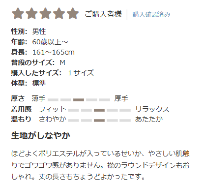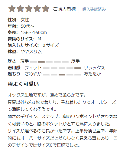 生地はしっかりしておりますが、かたい感じもなく、着心地もご好評いただいております。