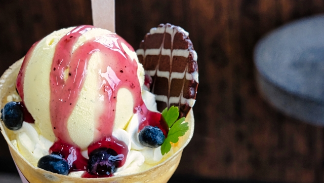 ボリュームのあるアイスクリームとほどよい甘さのこしあんに、赤えんどう豆や寒天、フルーツがトッピングされています。