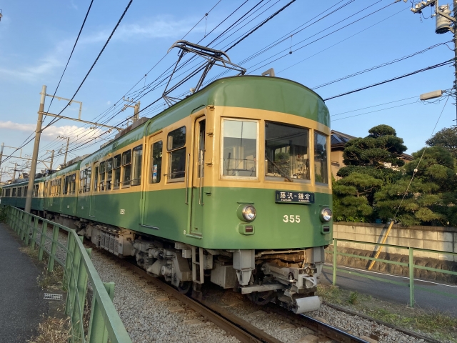 鳥居のすぐ前を江ノ電が走っている風景は、とても印象的です。