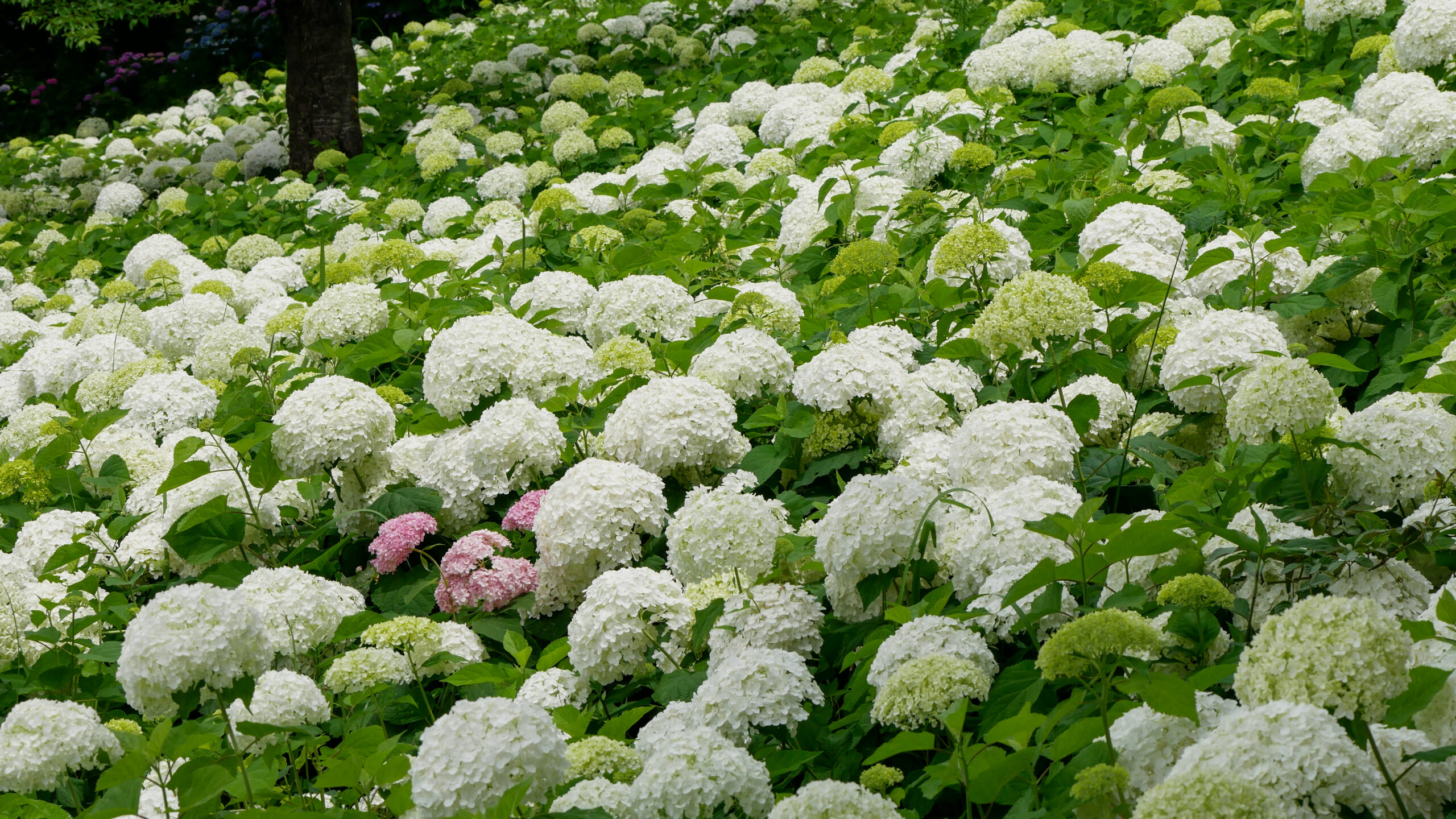 特にアナベルという品種のあじさいは、大きな手毬状の真っ白な花を咲かせるのが特徴で、品のある美しさに心惹かれること間違いなしです。